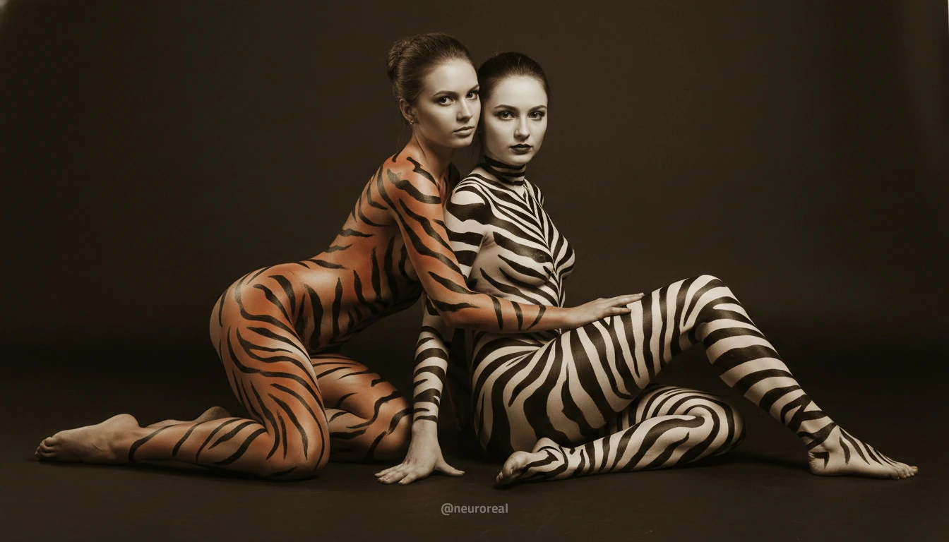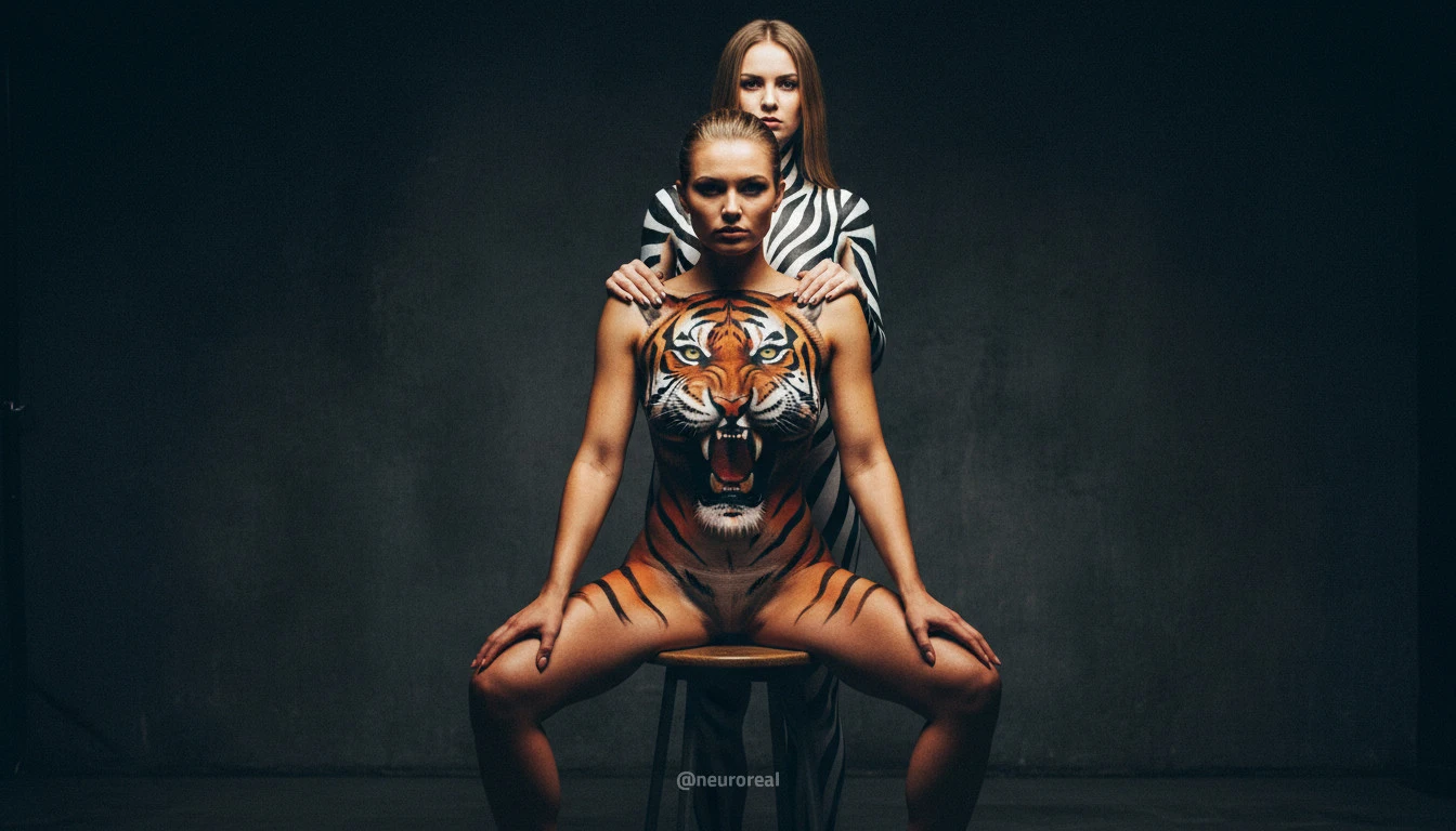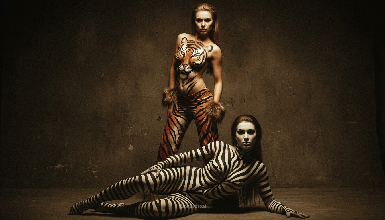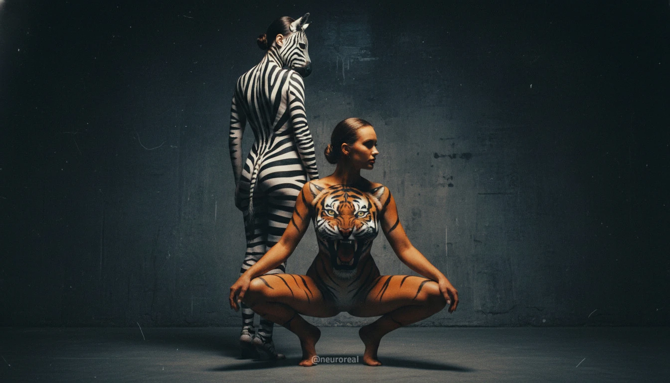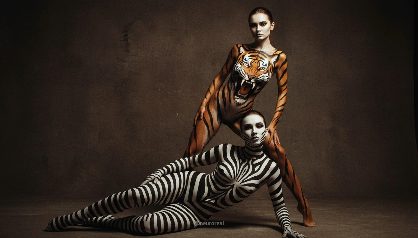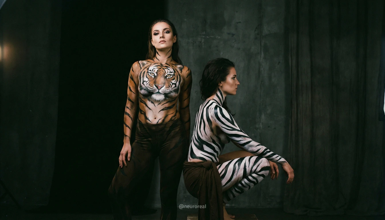 "Девушки демонстрируют яркие образы зебры и тигрицы, где боди-арт становится ключевым элементом, подчеркивая их дикую природную красоту. Каждый кадр превращается в захватывающую историю, где чёткие линии и узоры на коже создают эффектное сочетание с грациозными позами моделей, добавляя экзотики и харизмы."