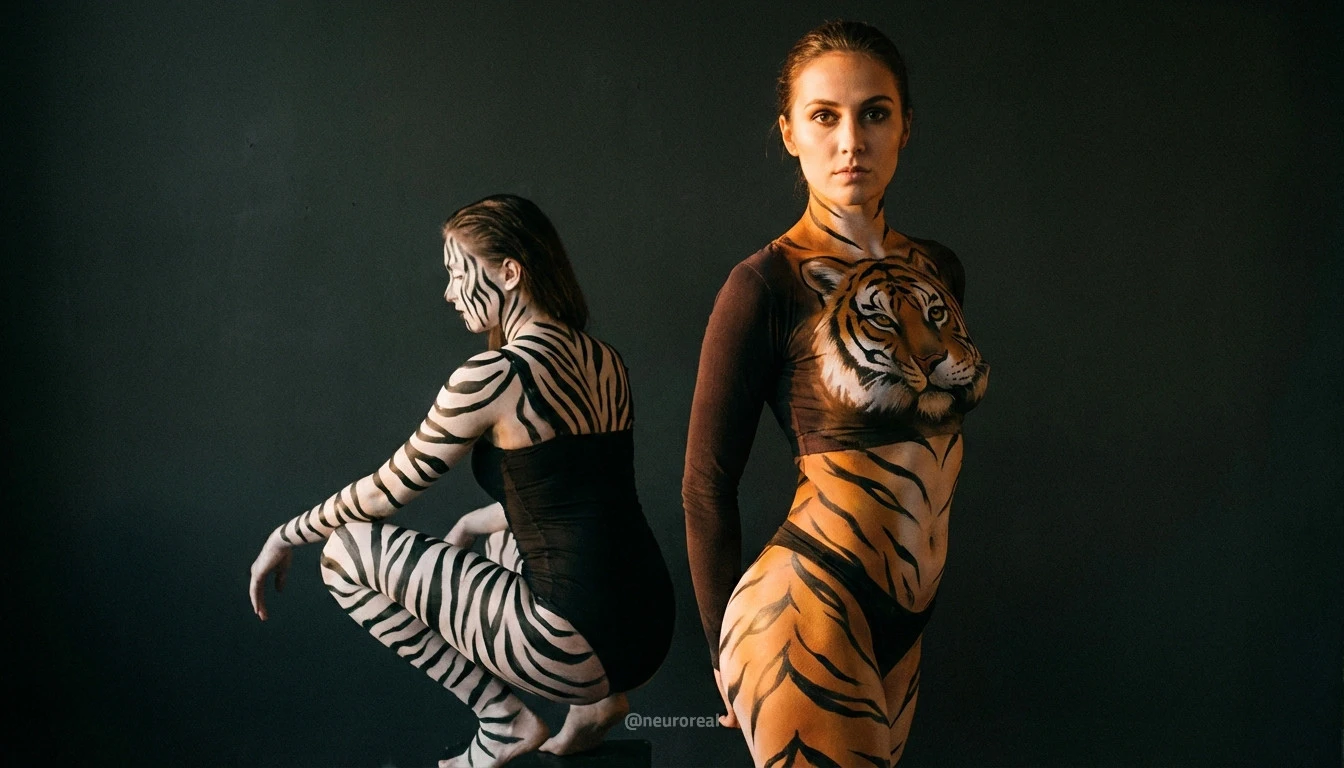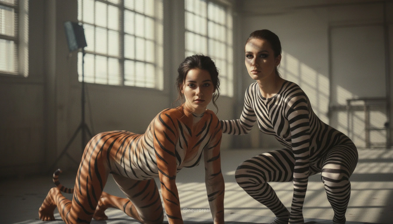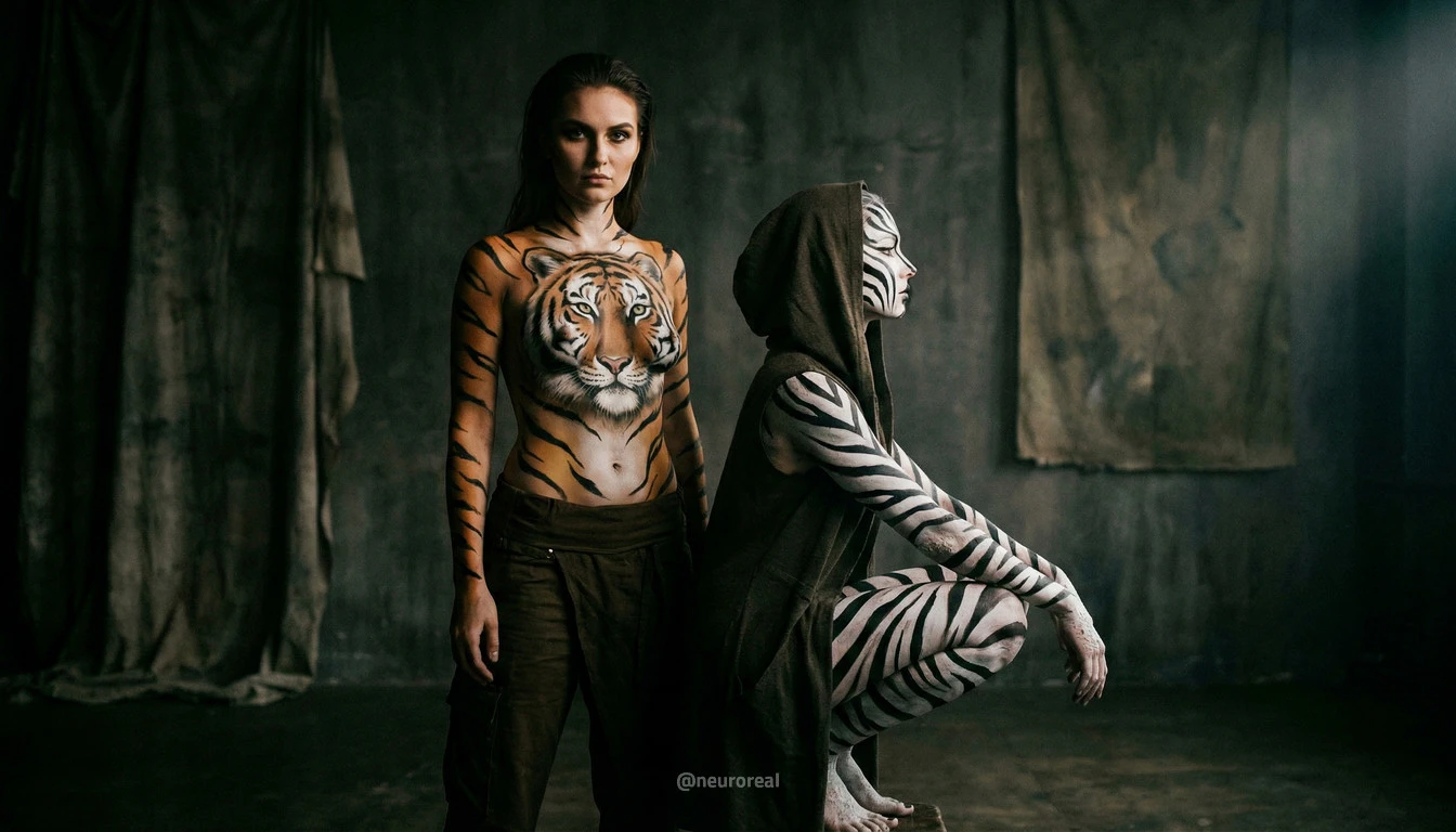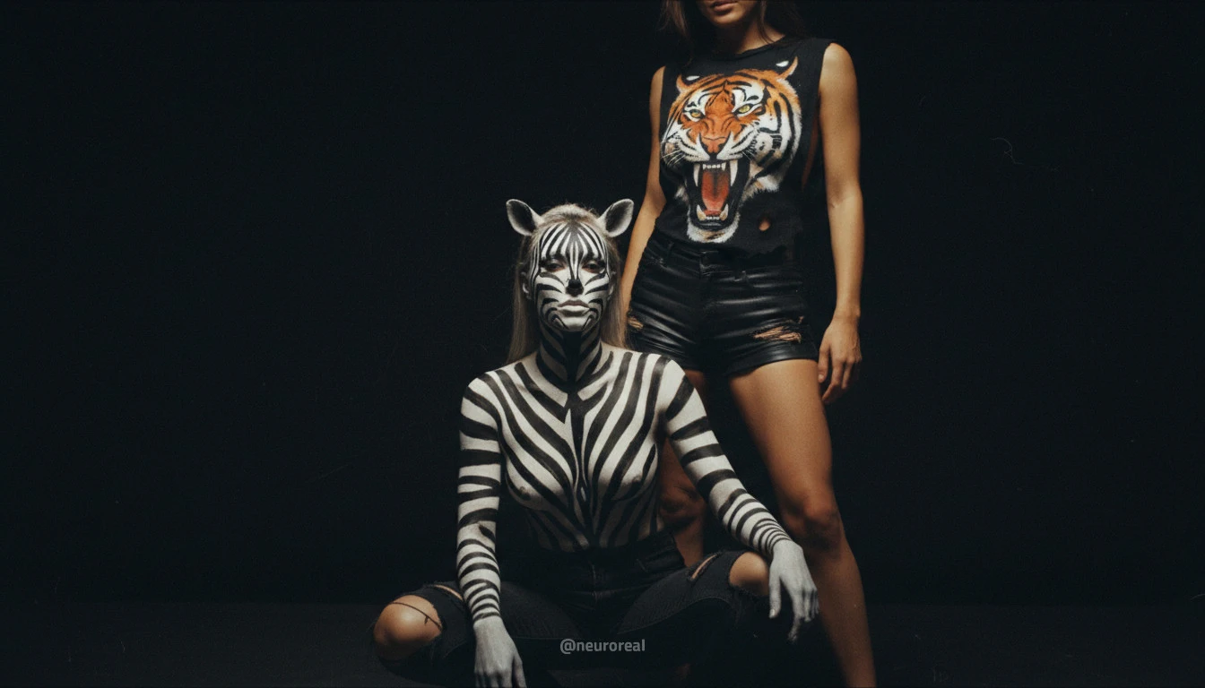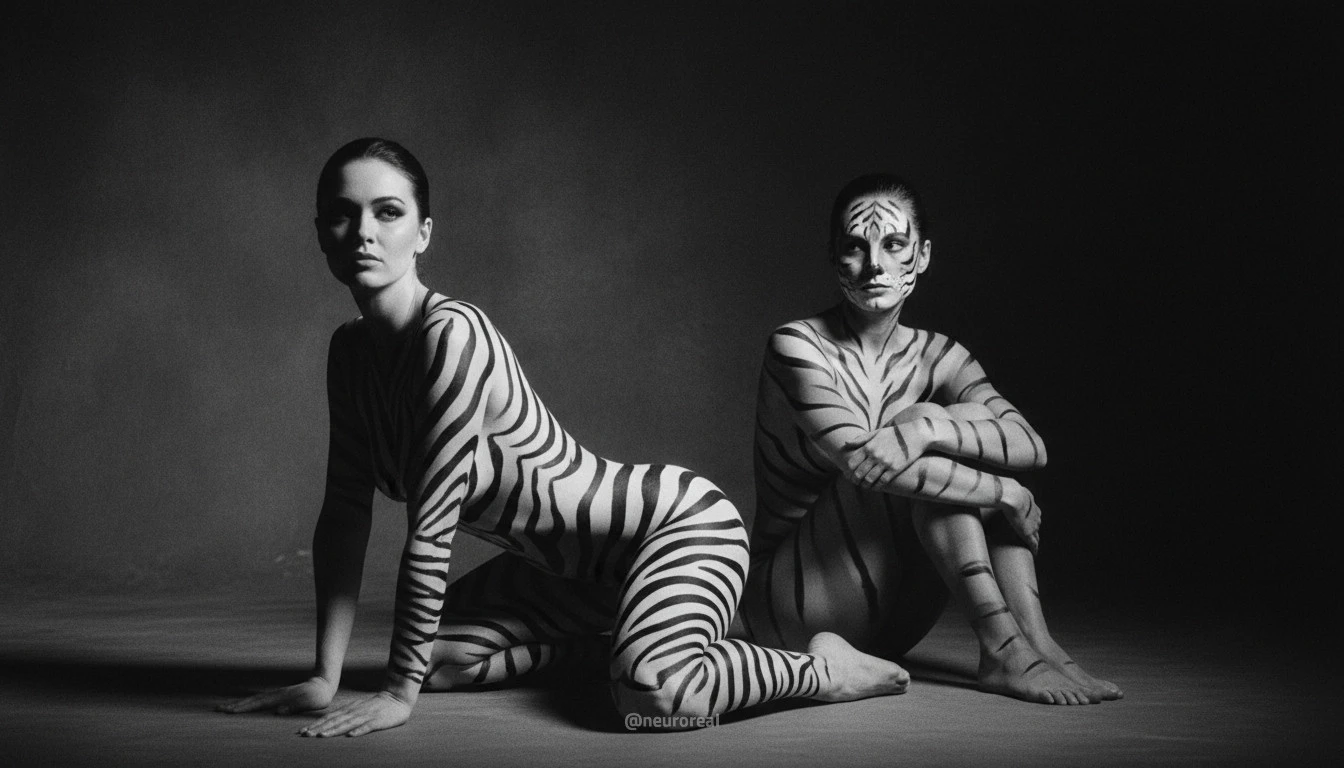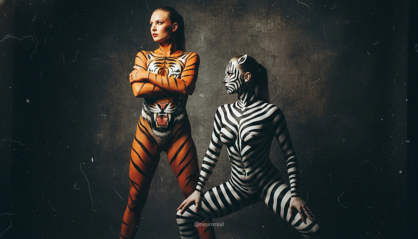 "Девушки демонстрируют яркие образы зебры и тигрицы, где боди-арт становится ключевым элементом, подчеркивая их дикую природную красоту. Каждый кадр превращается в захватывающую историю, где чёткие линии и узоры на коже создают эффектное сочетание с грациозными позами моделей, добавляя экзотики и харизмы."