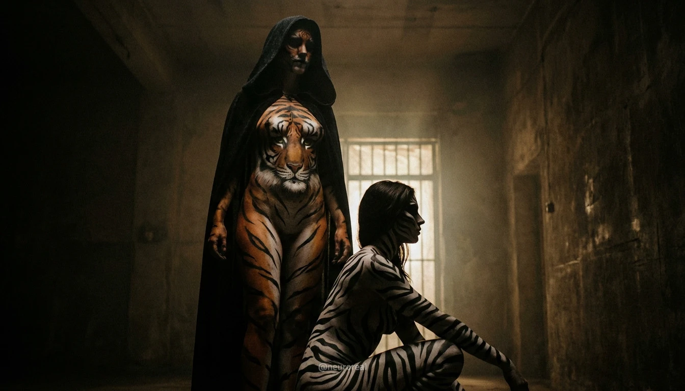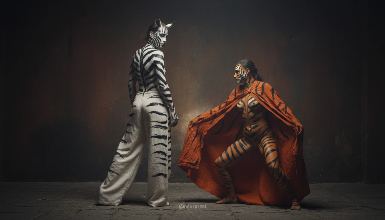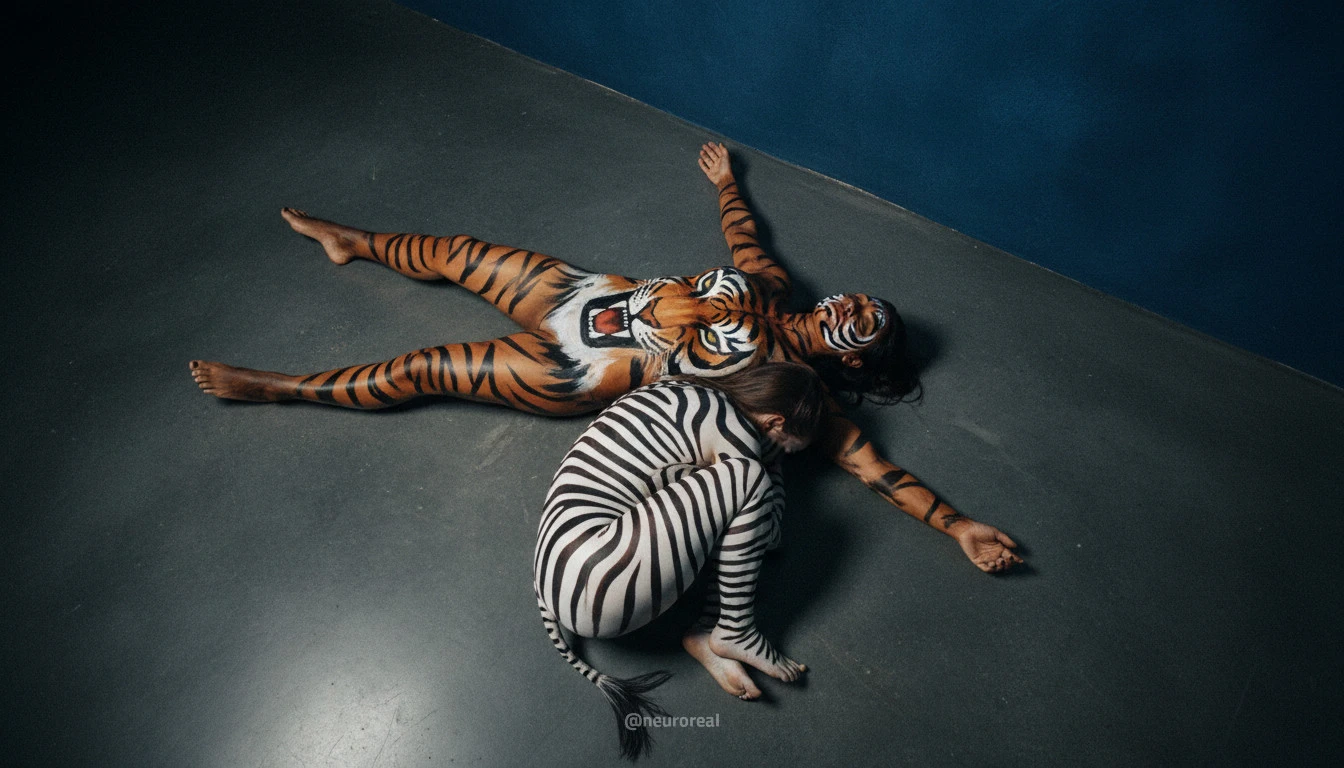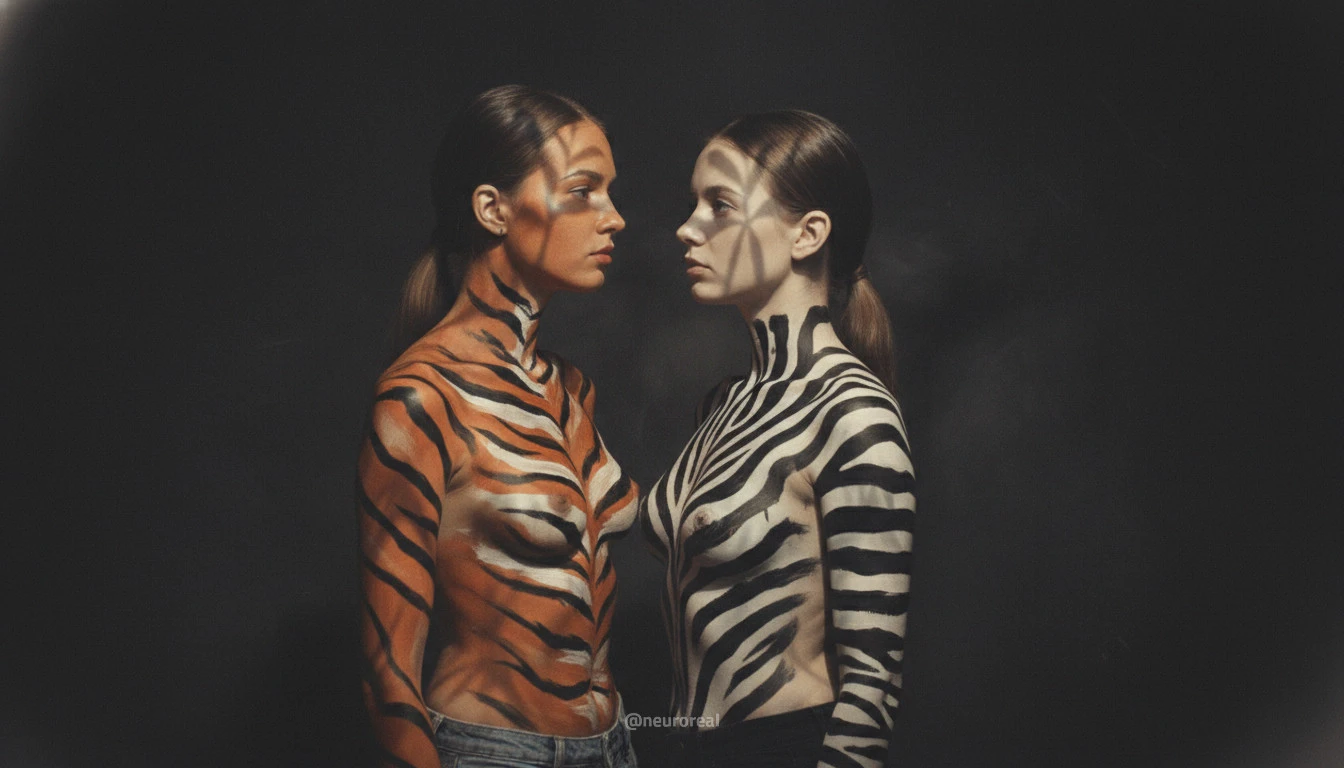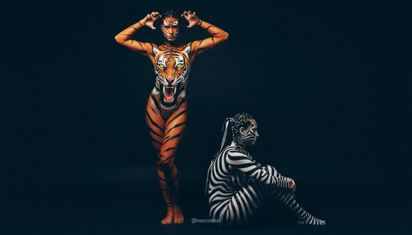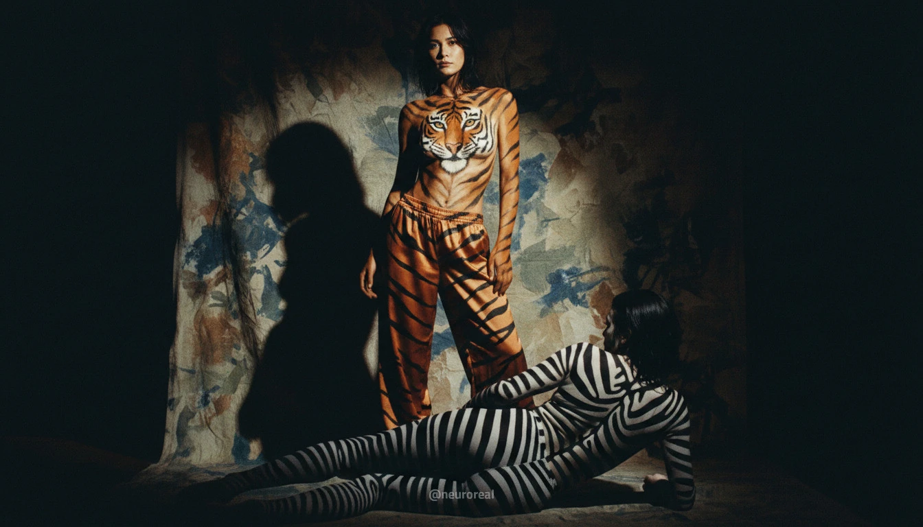 "Девушки демонстрируют яркие образы зебры и тигрицы, где боди-арт становится ключевым элементом, подчеркивая их дикую природную красоту. Каждый кадр превращается в захватывающую историю, где чёткие линии и узоры на коже создают эффектное сочетание с грациозными позами моделей, добавляя экзотики и харизмы."