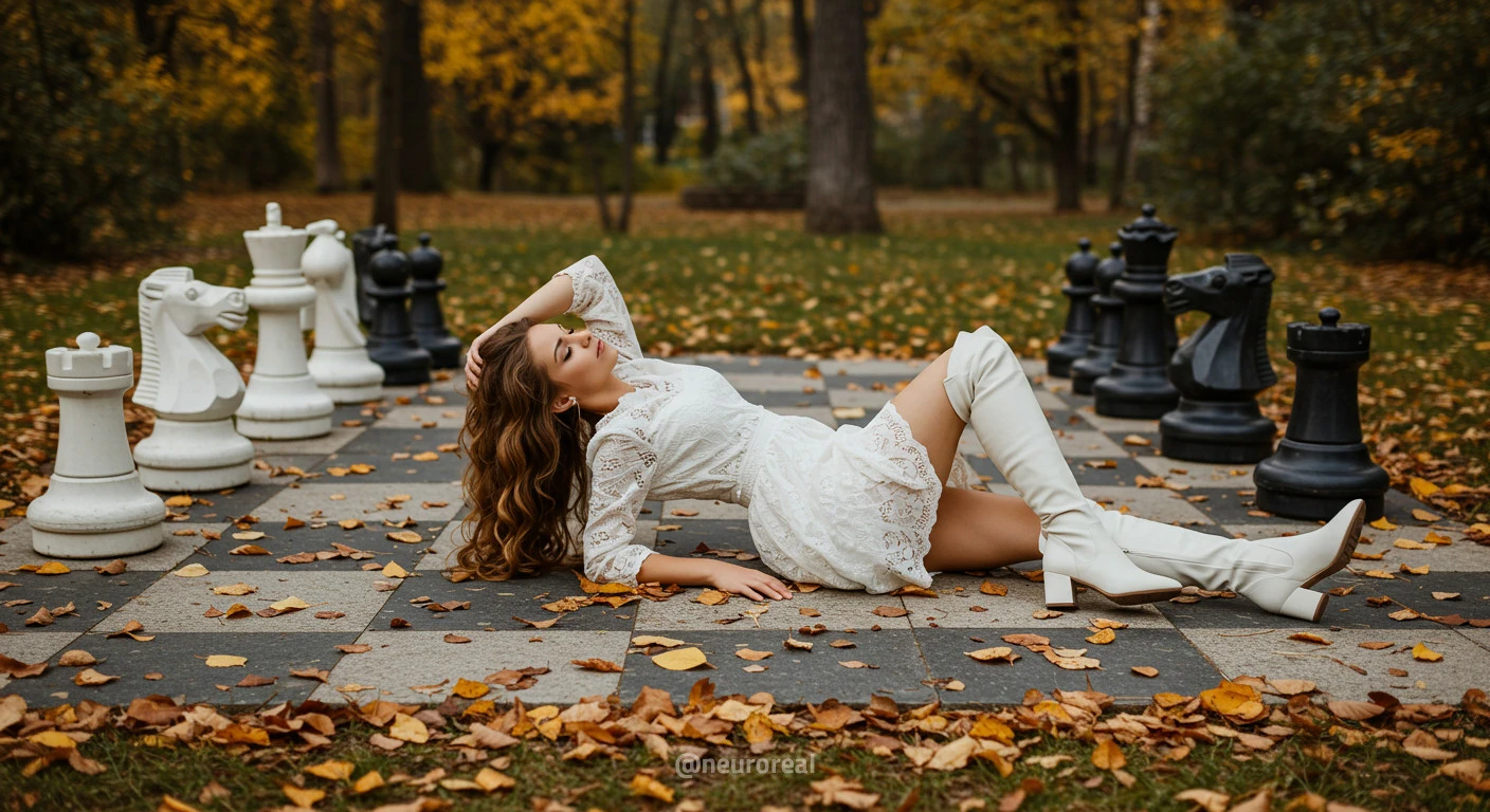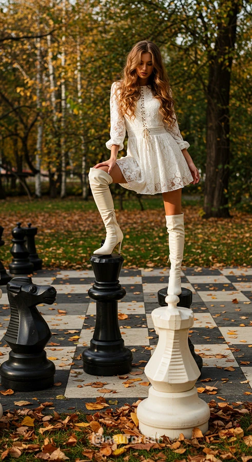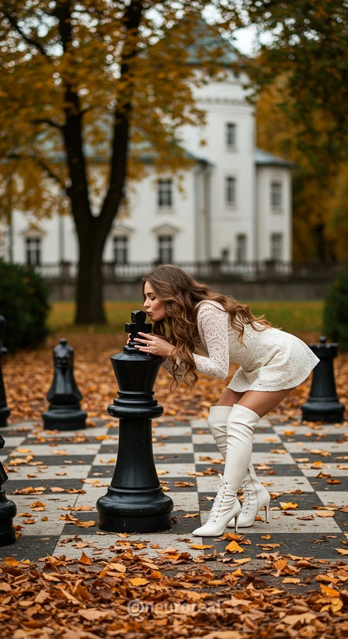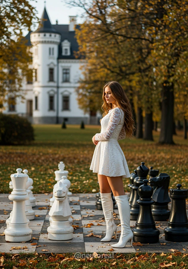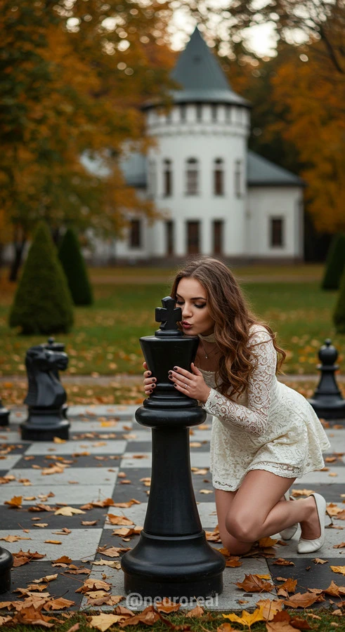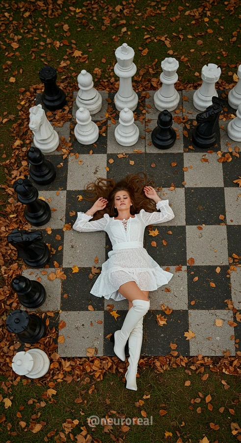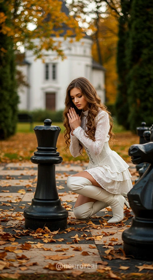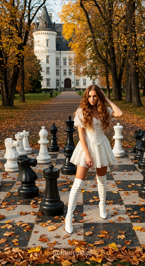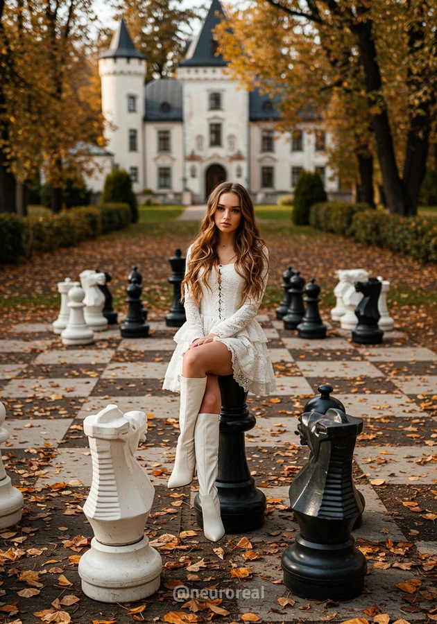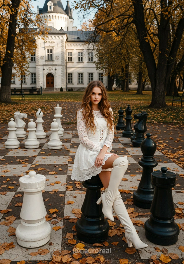 "В осеннем саду, среди золотых опавших листьев и холодного камня шахматной доски, модели в белых готических платьях создают зачаровывающую картину. Их грациозные образы гармонируют с четкими очертаниями шахматных фигур, объединяя хрупкость и монументальность, природу и искусство в единую композицию света и тени."