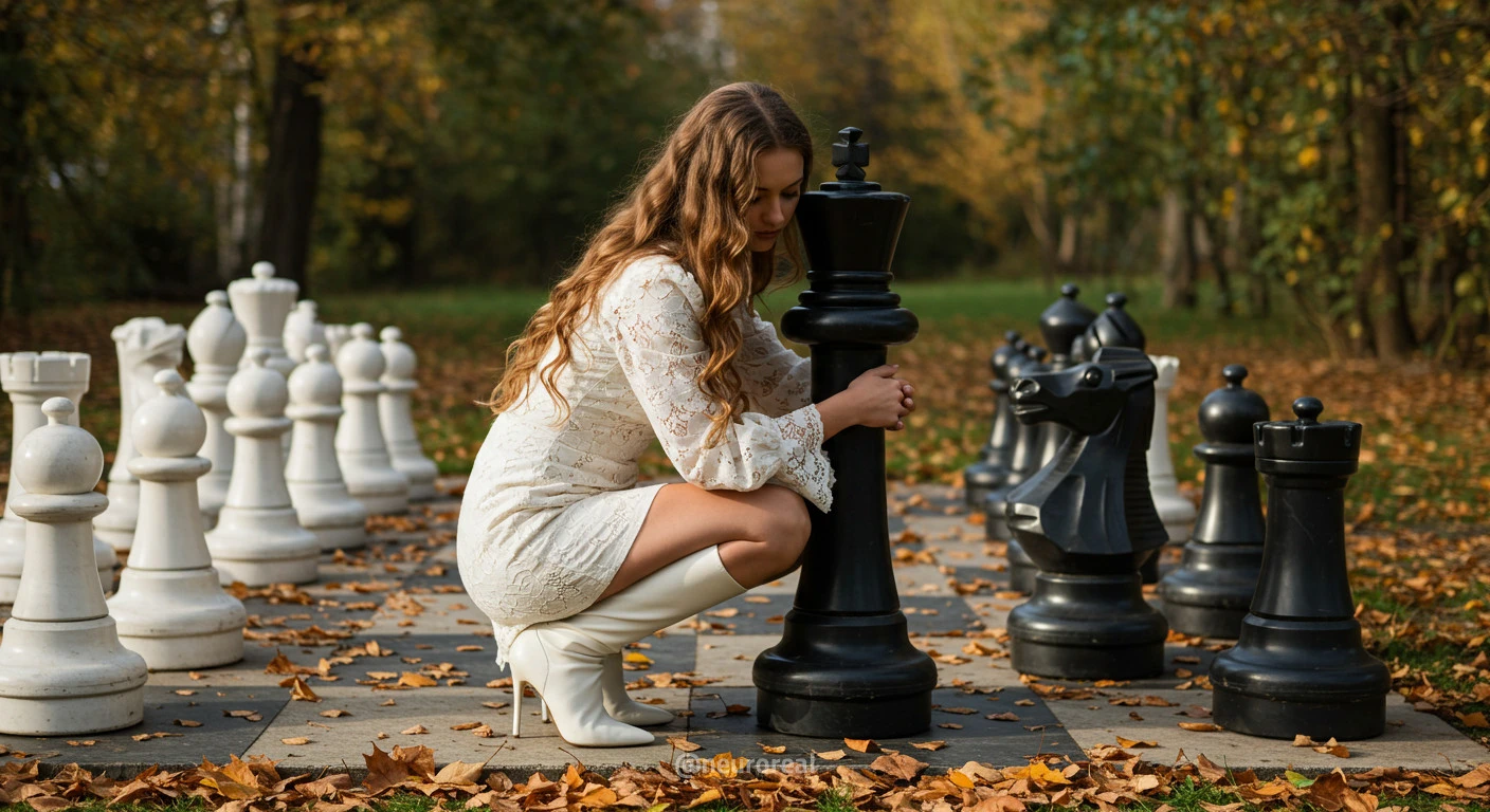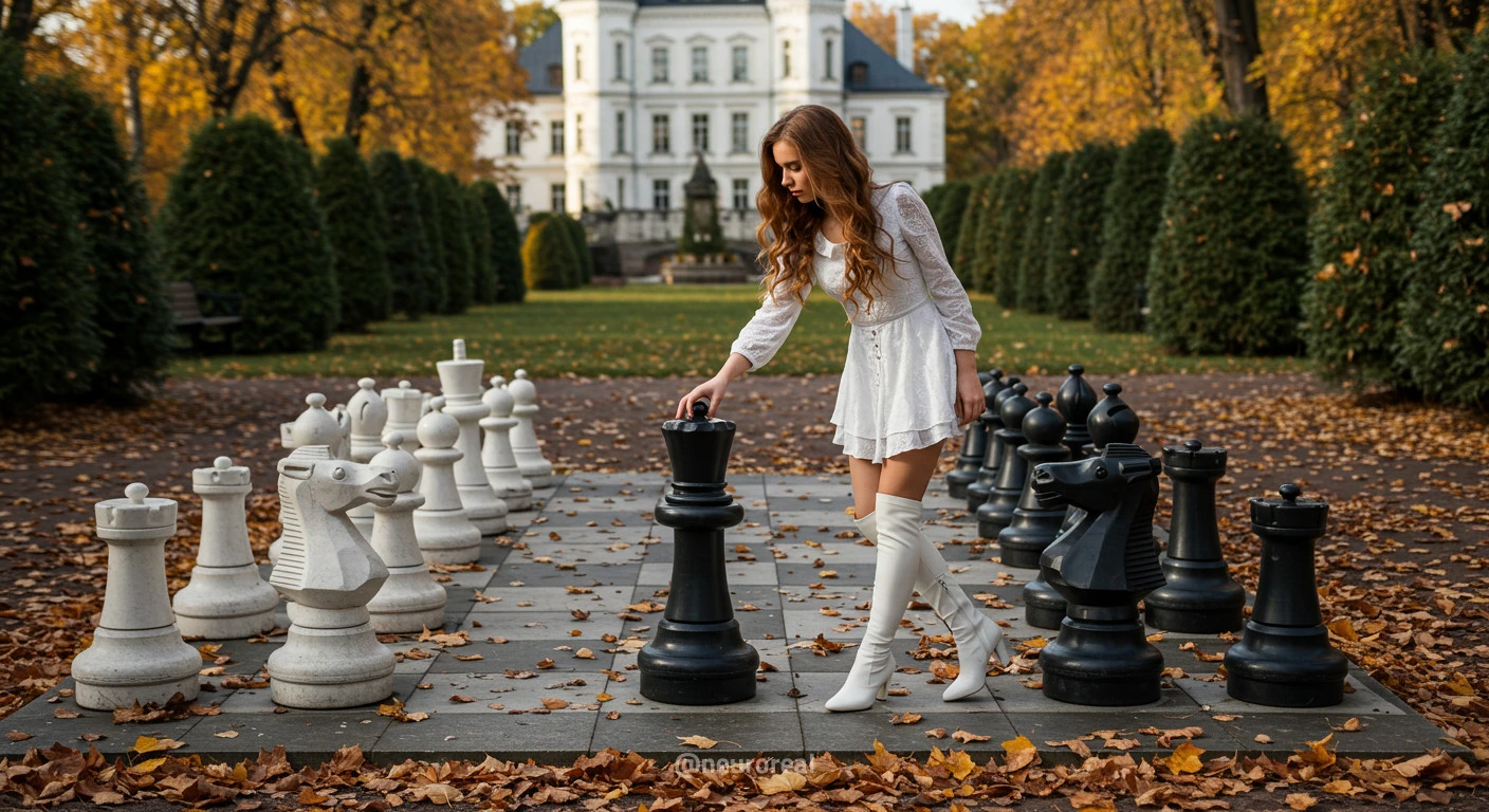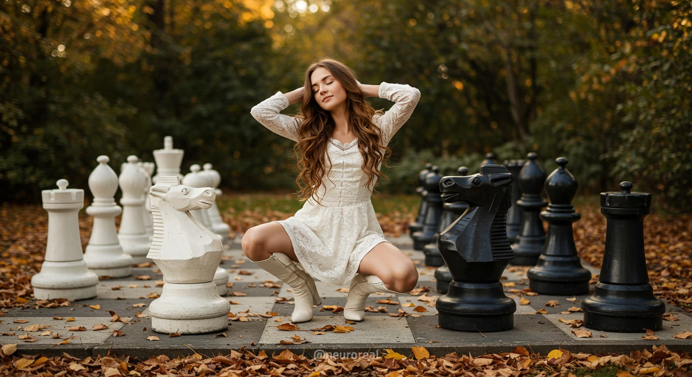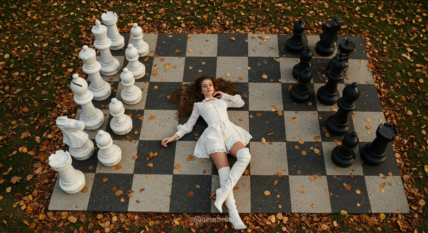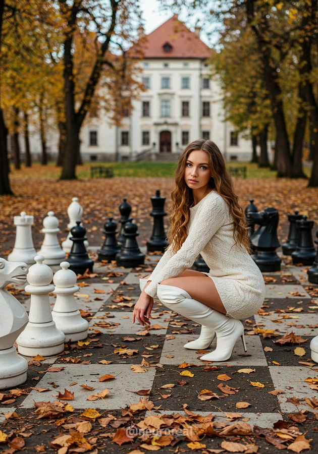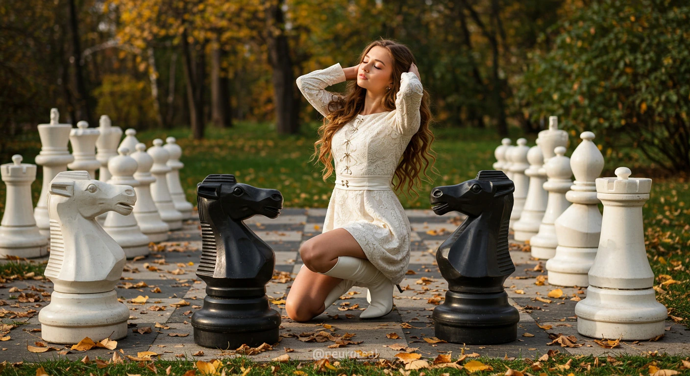 "В осеннем саду, среди золотых опавших листьев и холодного камня шахматной доски, модели в белых готических платьях создают зачаровывающую картину. Их грациозные образы гармонируют с четкими очертаниями шахматных фигур, объединяя хрупкость и монументальность, природу и искусство в единую композицию света и тени."