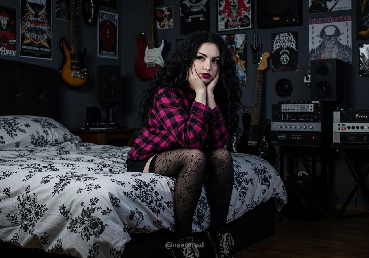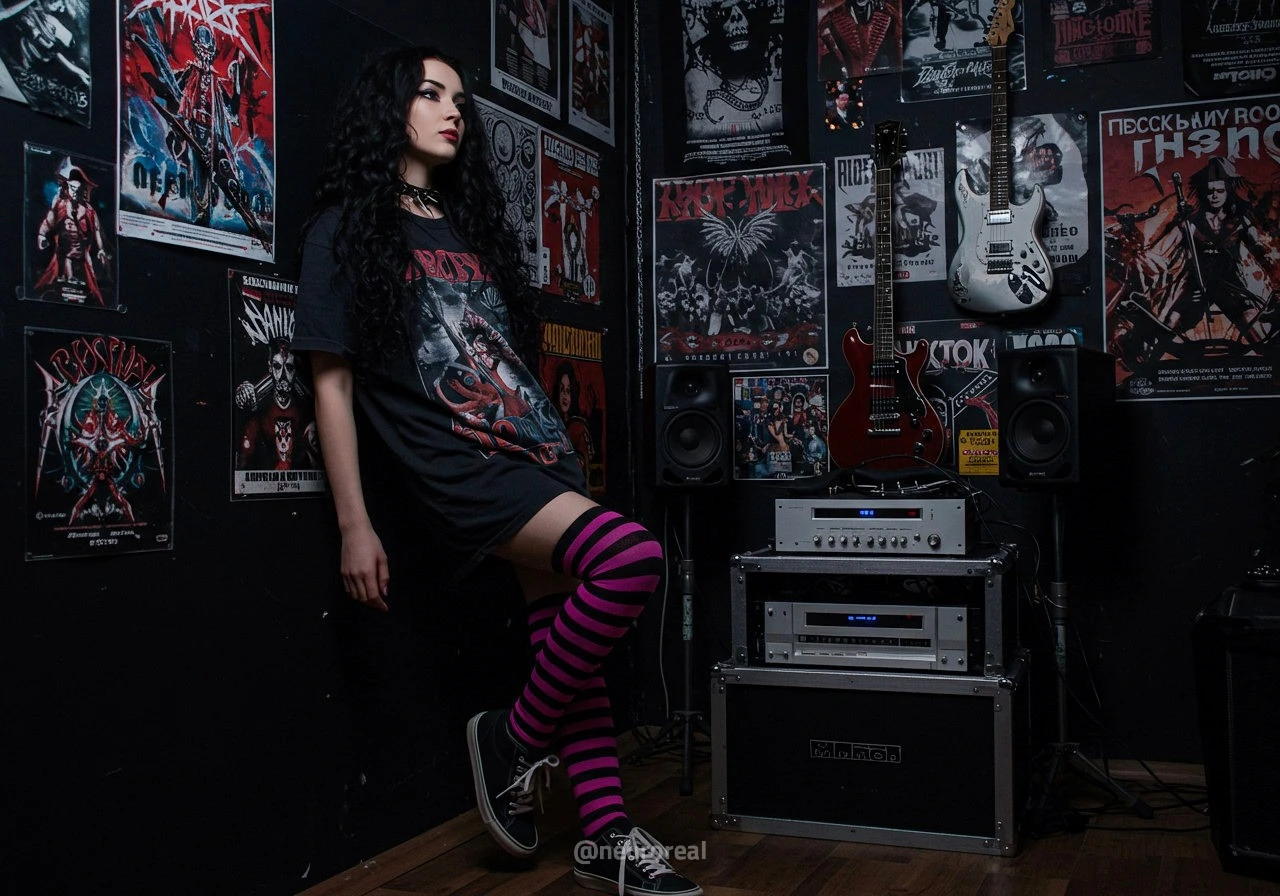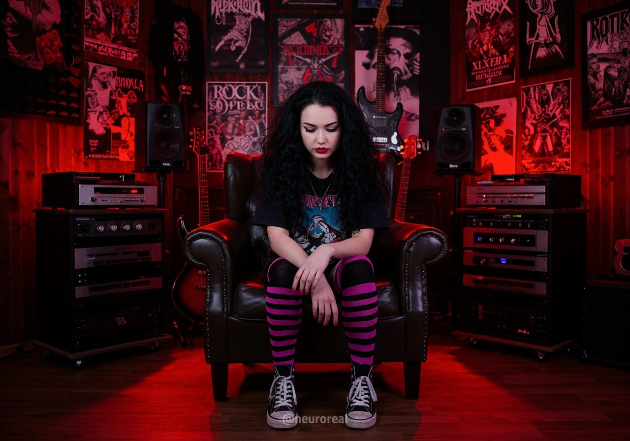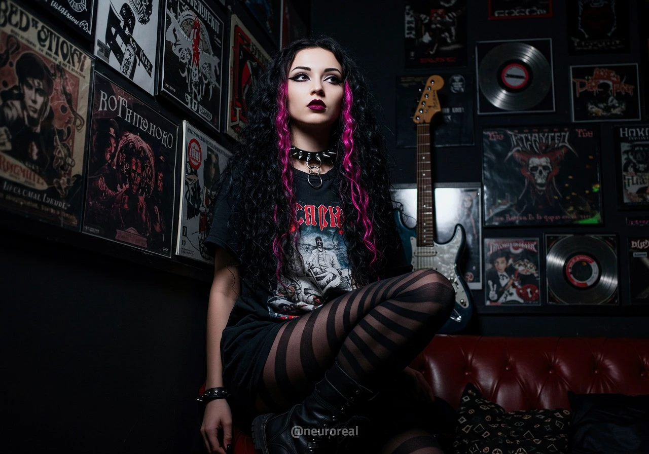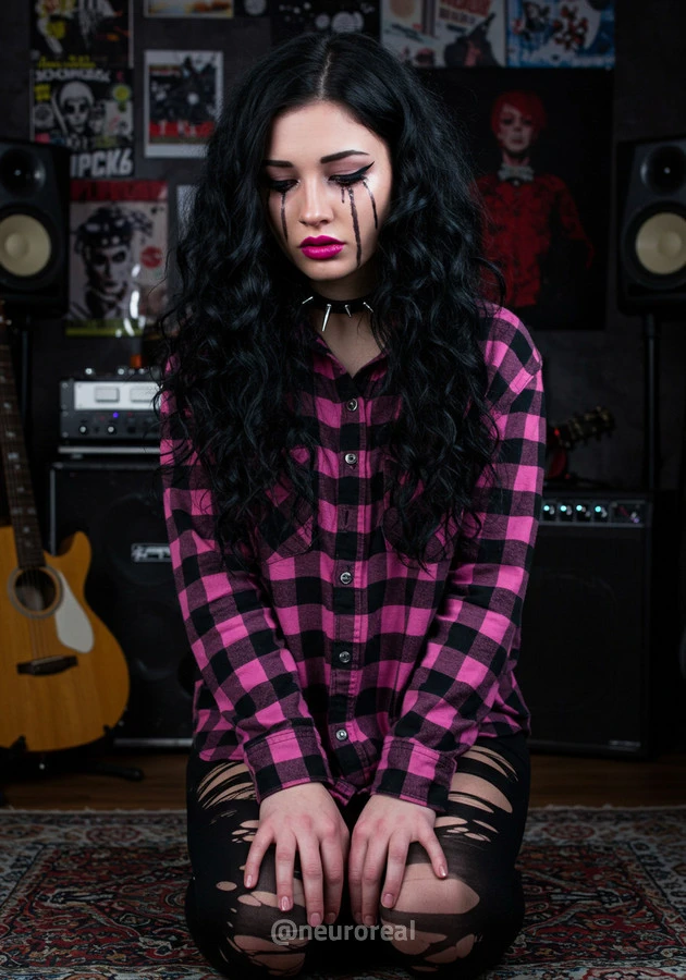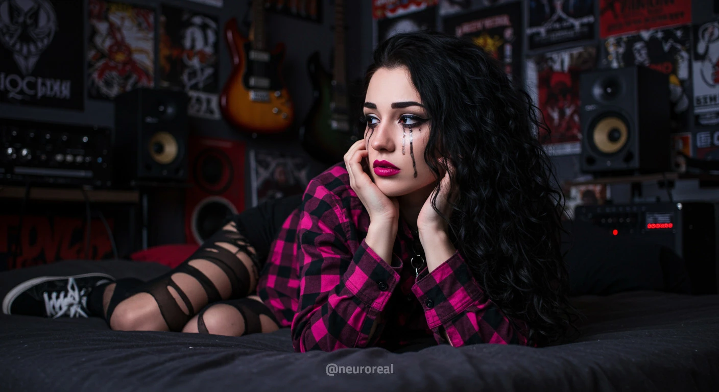 "В полумраке квартиры друга-рокера Вероника предстаёт в образе эмо, гармонично вписываясь в атмосферу рок-эстетики. Тёмные стены украшены гитарами, постерами и винилом — всё здесь дышит энергией музыки и свободы. Колонки замерли в ожидании рифа, а по её щекам скользят слёзы, выдавая глубоко спрятанные переживания."