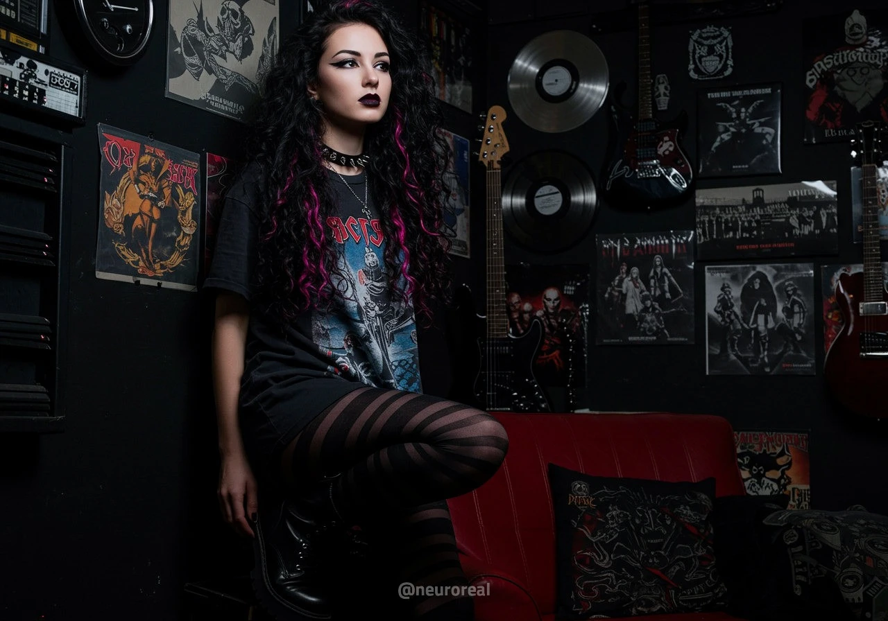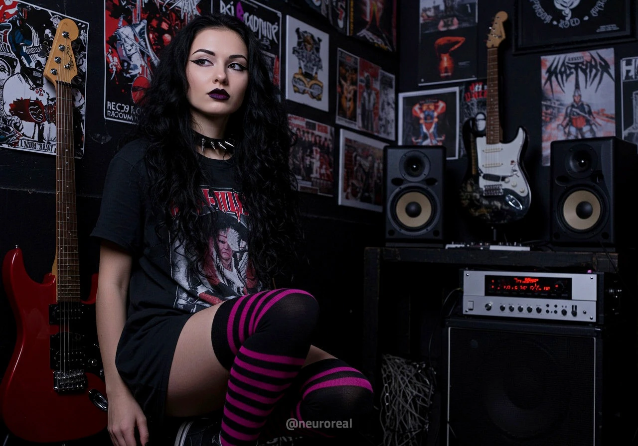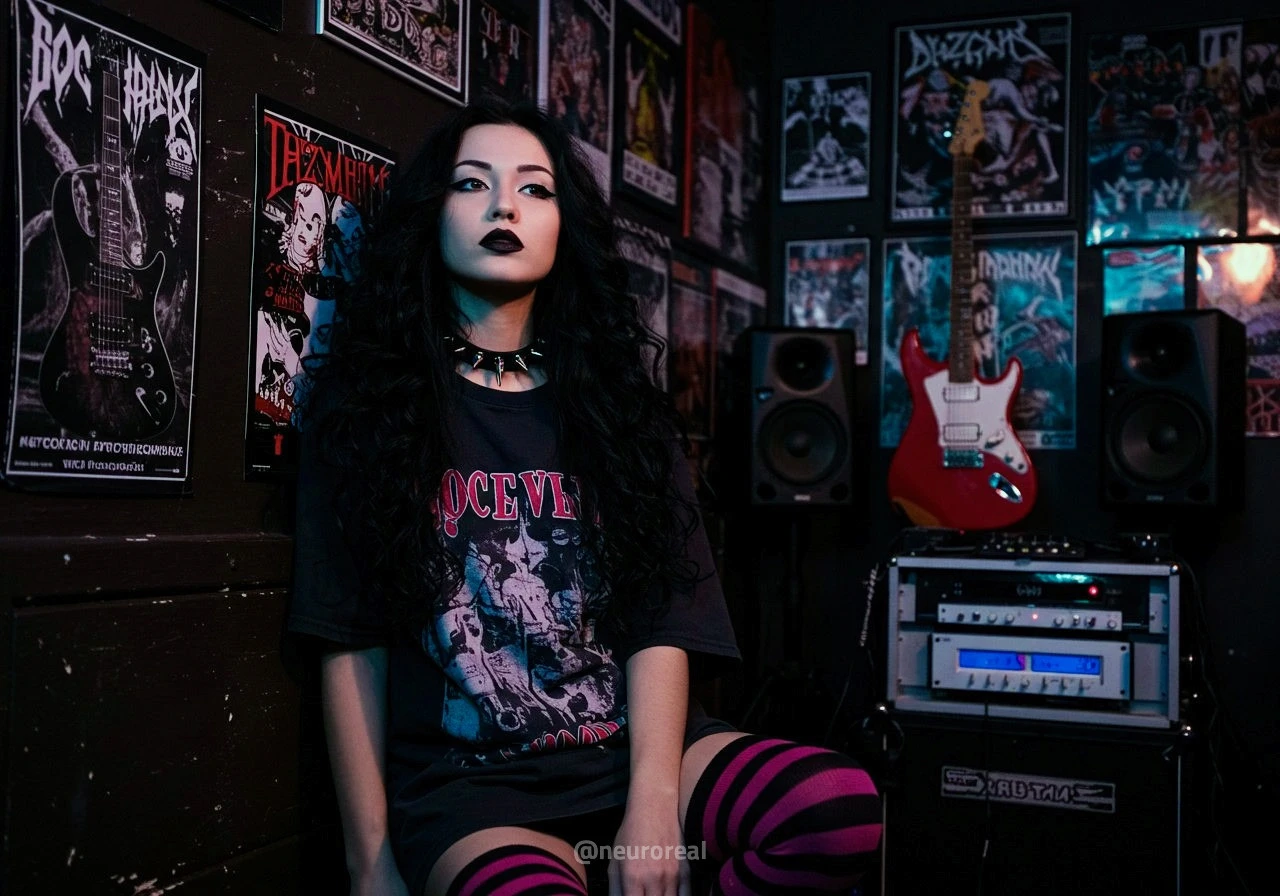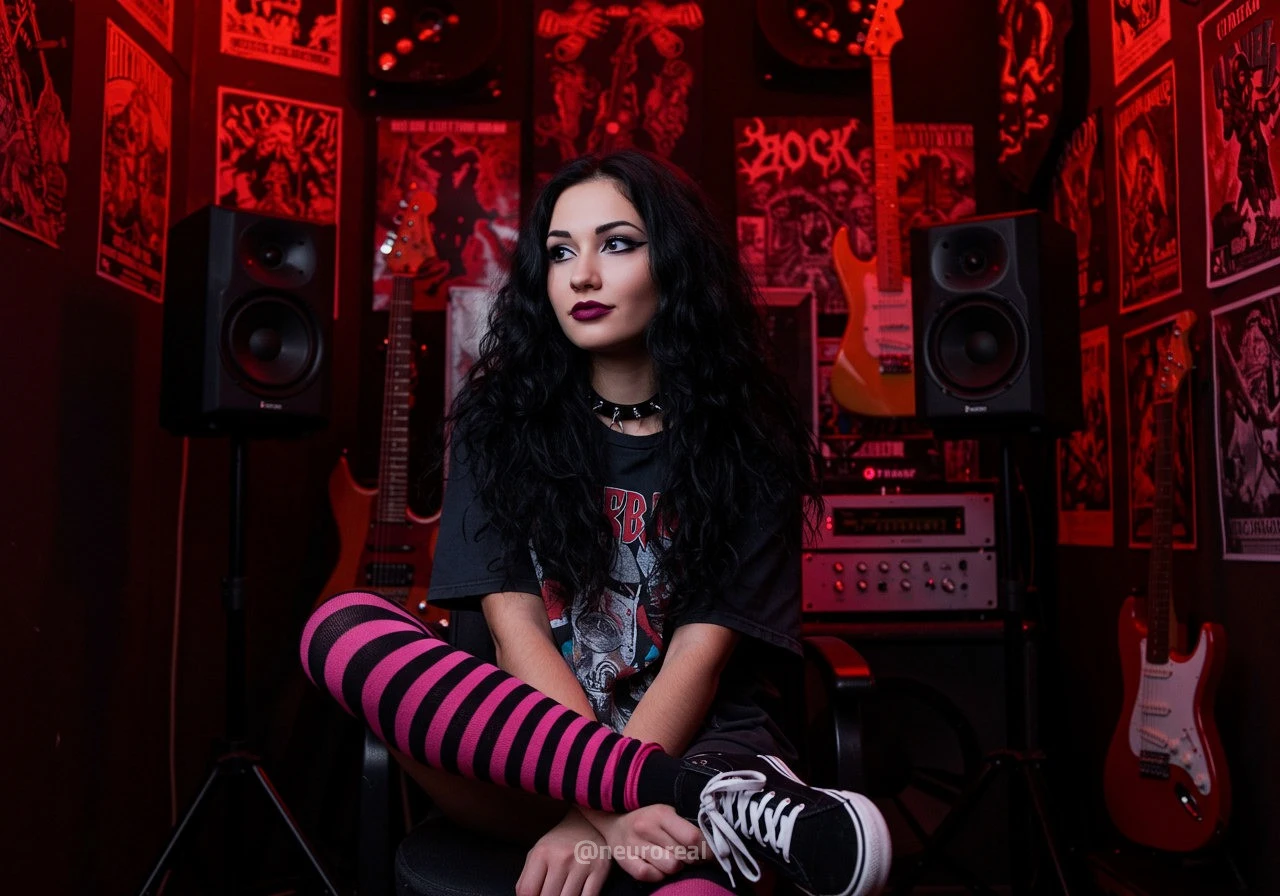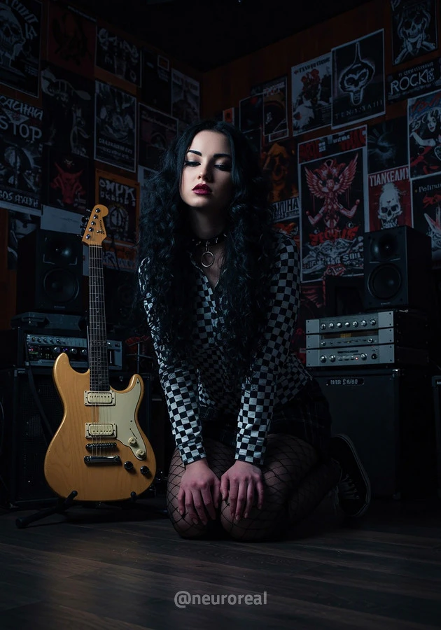 "В полумраке квартиры друга-рокера Вероника предстаёт в образе эмо, гармонично вписываясь в атмосферу рок-эстетики. Тёмные стены украшены гитарами, постерами и винилом — всё здесь дышит энергией музыки и свободы. Колонки замерли в ожидании рифа, а по её щекам скользят слёзы, выдавая глубоко спрятанные переживания."