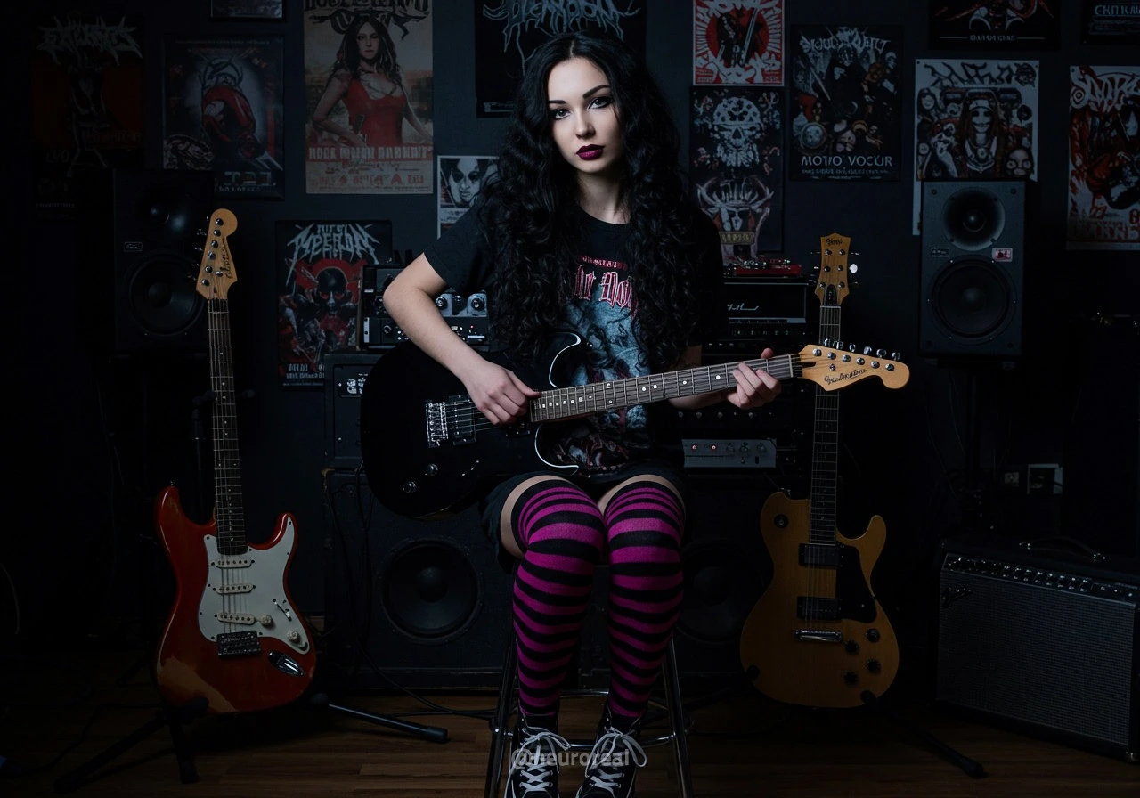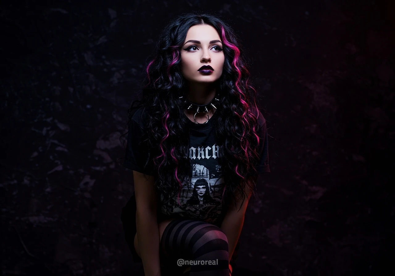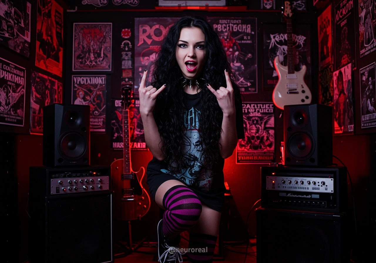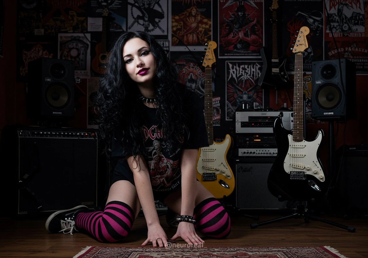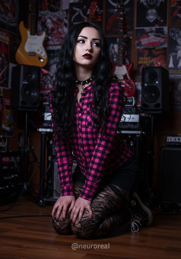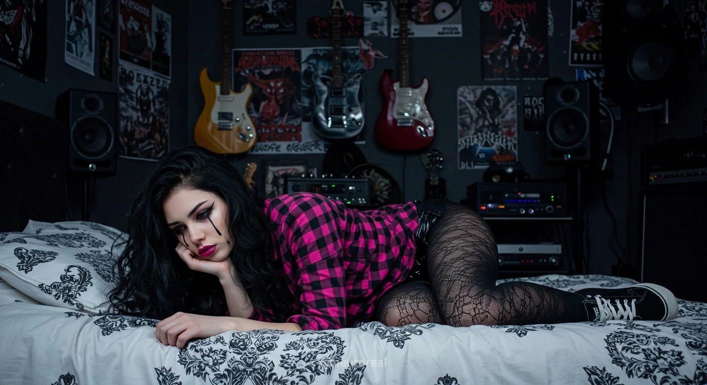 "В полумраке квартиры друга-рокера Вероника предстаёт в образе эмо, гармонично вписываясь в атмосферу рок-эстетики. Тёмные стены украшены гитарами, постерами и винилом — всё здесь дышит энергией музыки и свободы. Колонки замерли в ожидании рифа, а по её щекам скользят слёзы, выдавая глубоко спрятанные переживания."