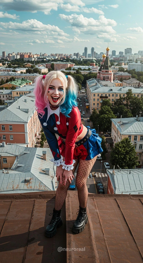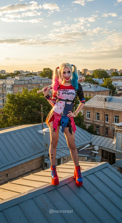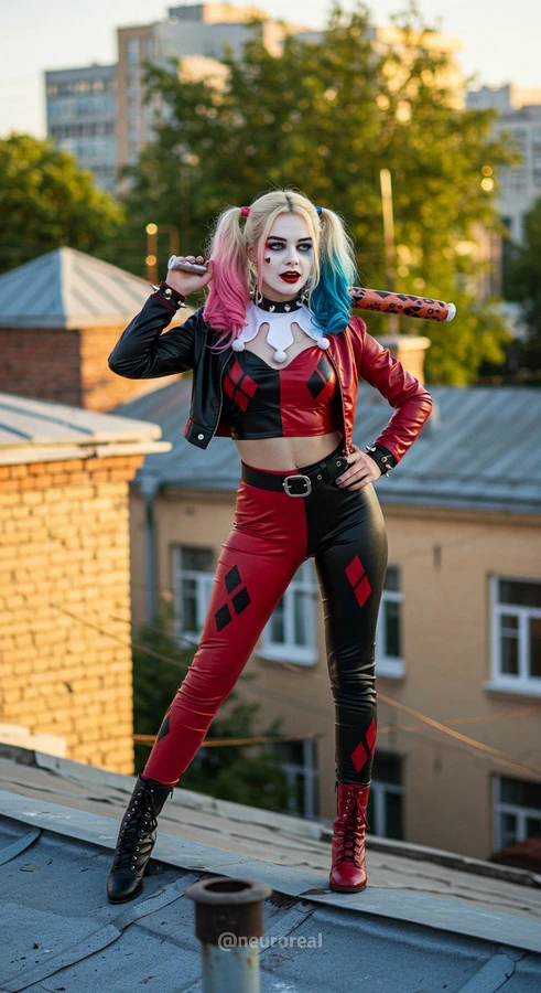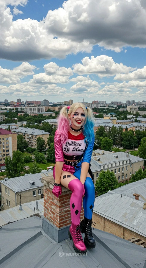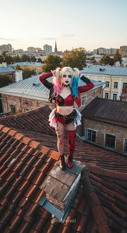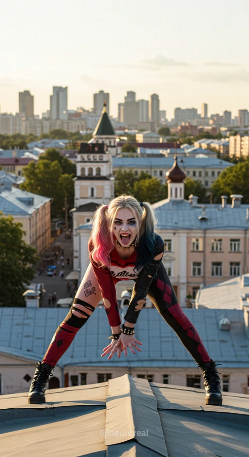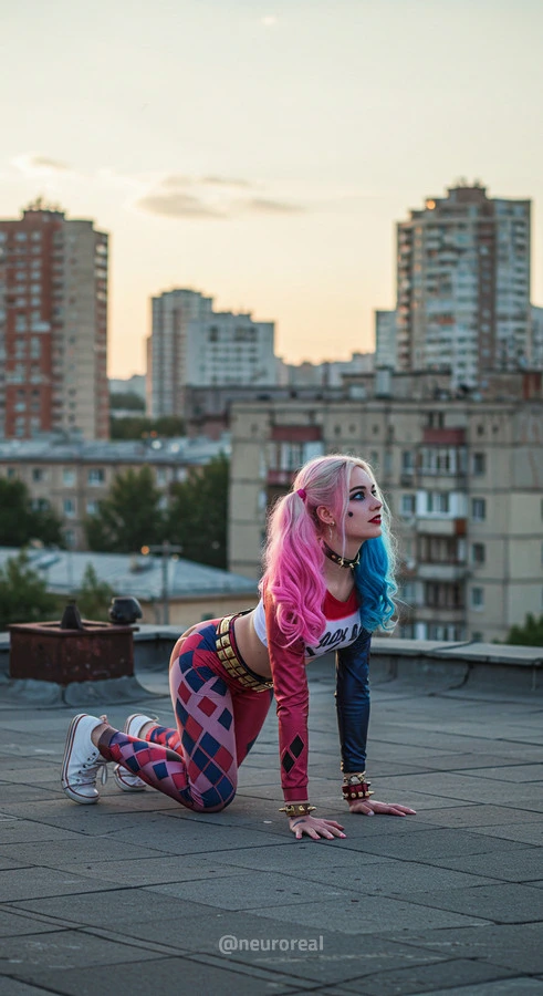 "Девушка в образе Харли Квинн, позирует на крыше дома, где её силуэт выделяется на фоне бескрайней городской панорамы. Затем она спускается во двор, и её дерзкий облик словно вливает каплю яркой краски в серые стены домов и однообразие окружающих пейзажей. Броский костюм подчеркивает её несгибаемую харизму, создавая игривый и острый контраст между необузданной энергией персонажа и строгой, сдержанной атмосферой мегаполиса."