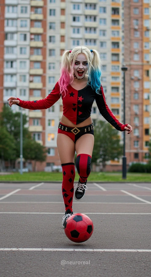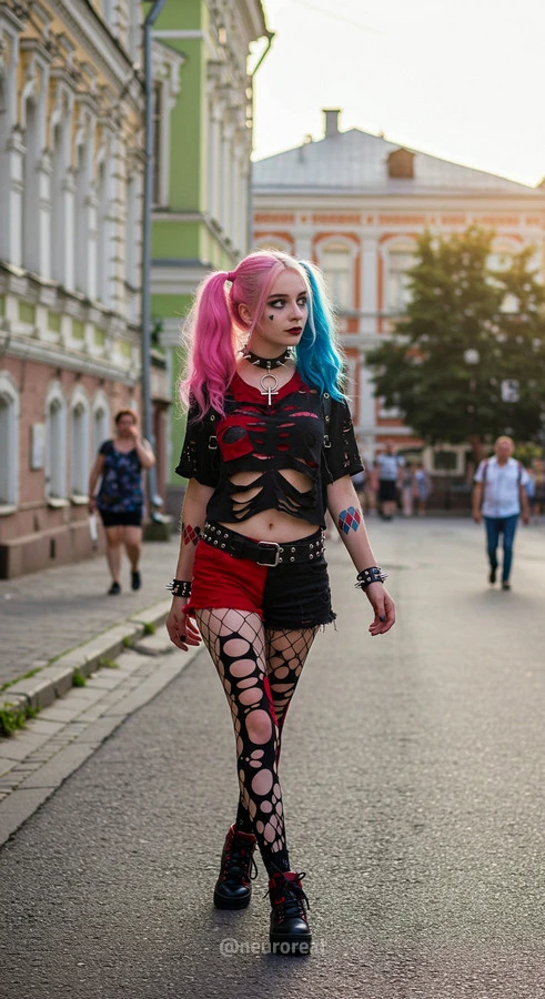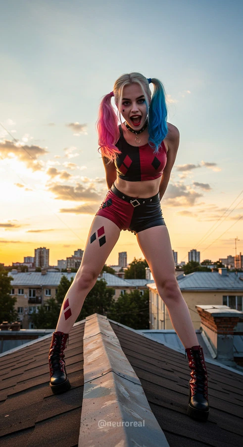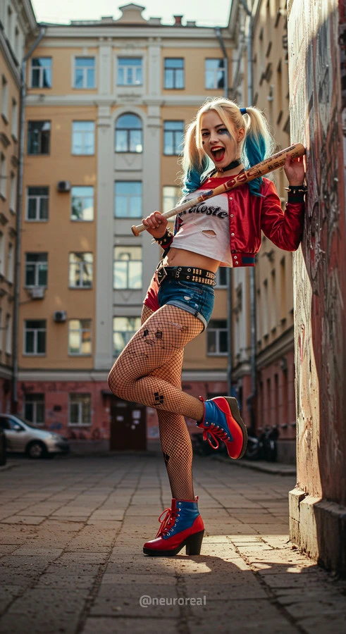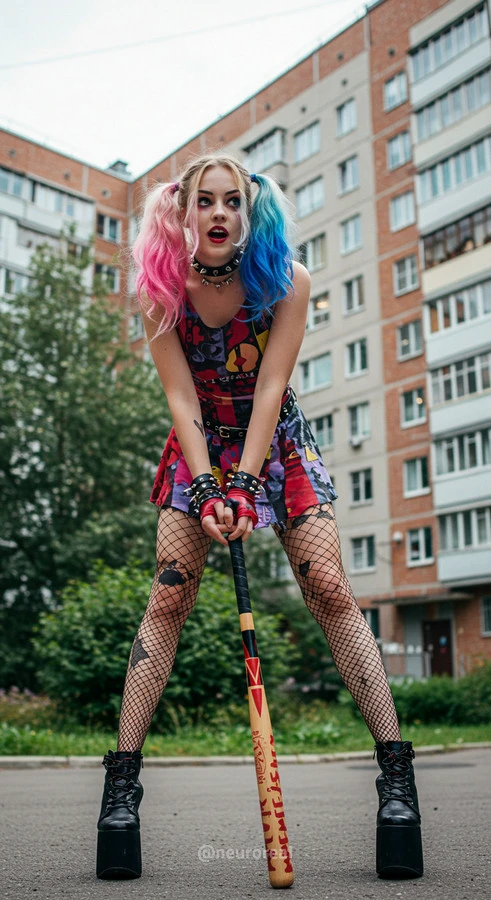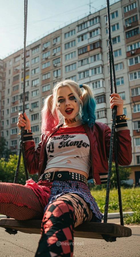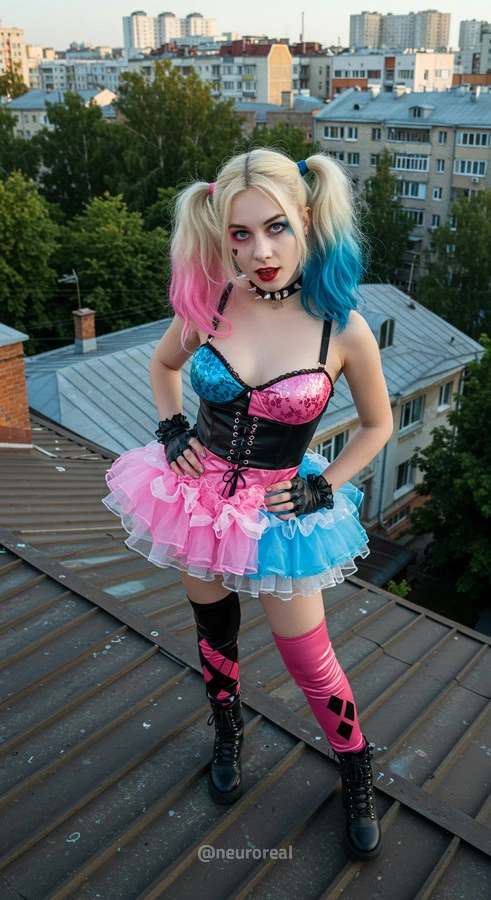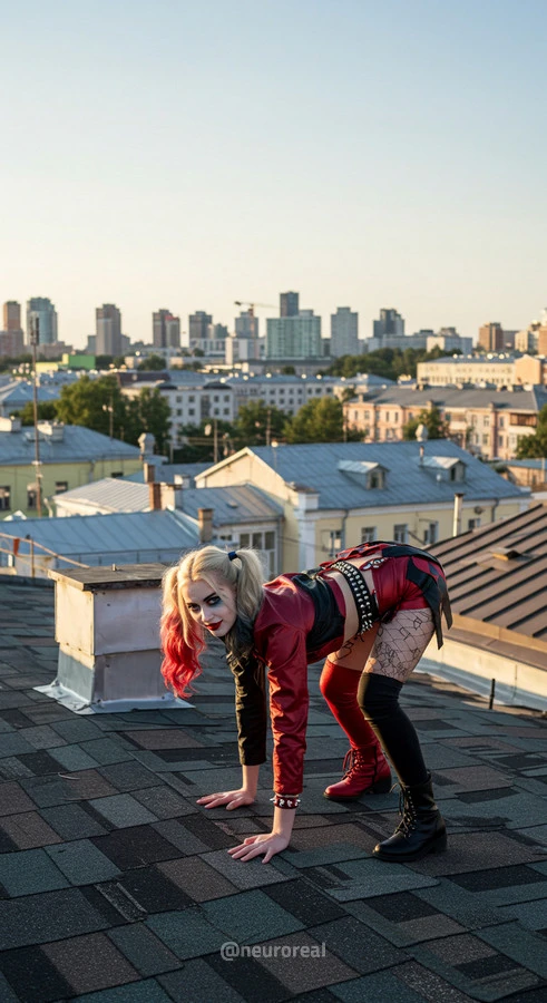 "Девушка в образе Харли Квинн, позирует на крыше дома, где её силуэт выделяется на фоне бескрайней городской панорамы. Затем она спускается во двор, и её дерзкий облик словно вливает каплю яркой краски в серые стены домов и однообразие окружающих пейзажей. Броский костюм подчеркивает её несгибаемую харизму, создавая игривый и острый контраст между необузданной энергией персонажа и строгой, сдержанной атмосферой мегаполиса."