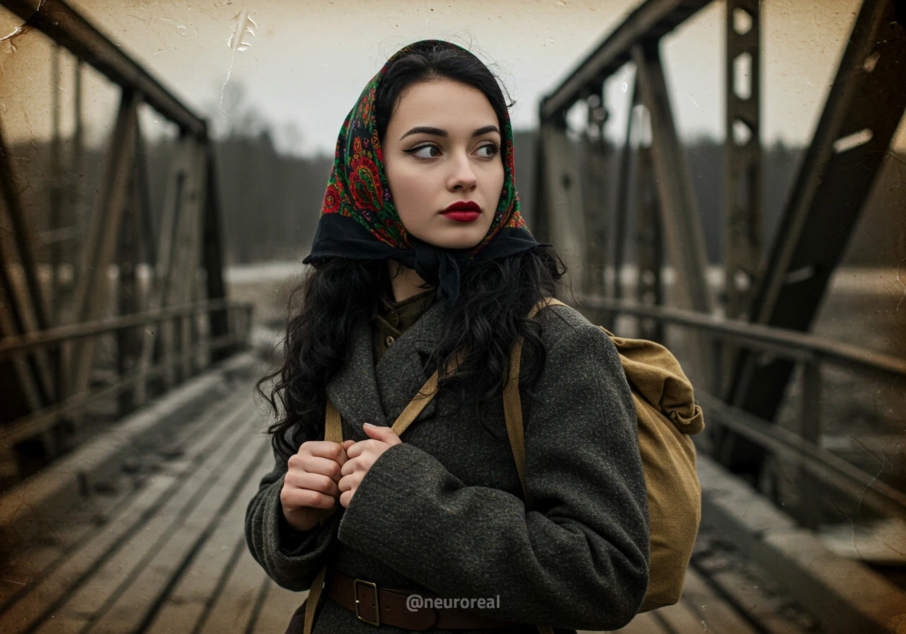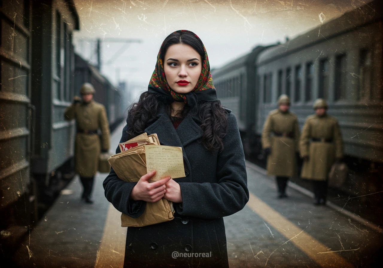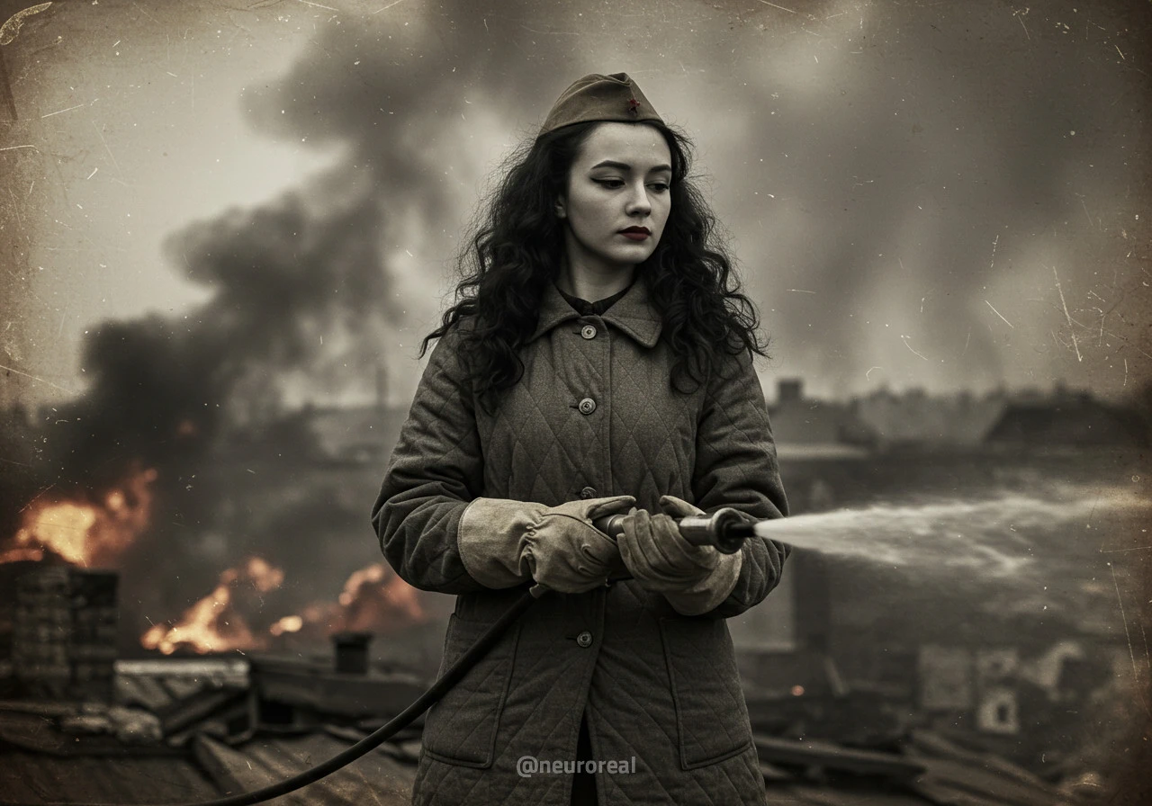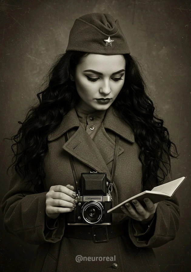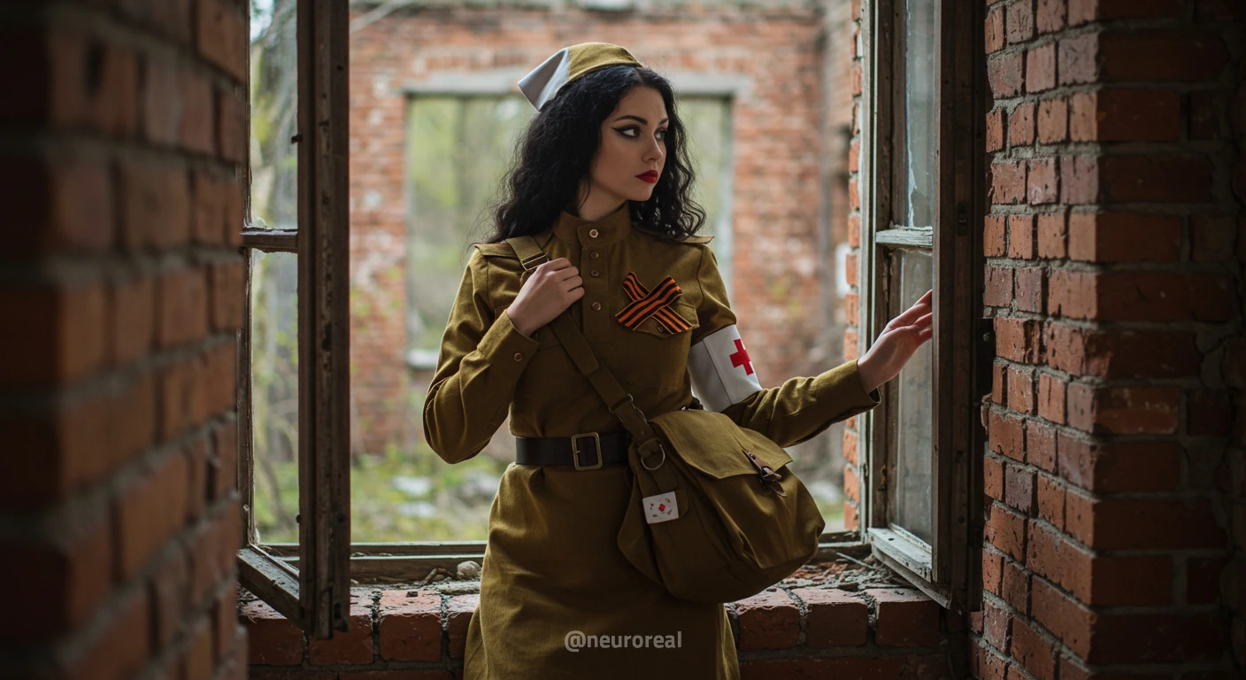 "Фотосессия посвящена событиям Второй мировой войны, отражающим напряжённость и драматизм эпохи. Через образы молодой героини передаются эмоции, решимость и мужество в условиях военного конфликта. Снимки реконструируют историческую атмосферу и подчёркивают значимость пережитого времени."