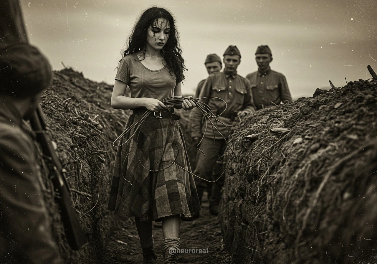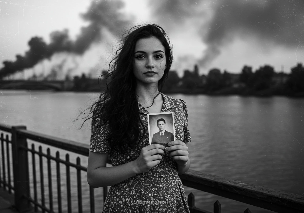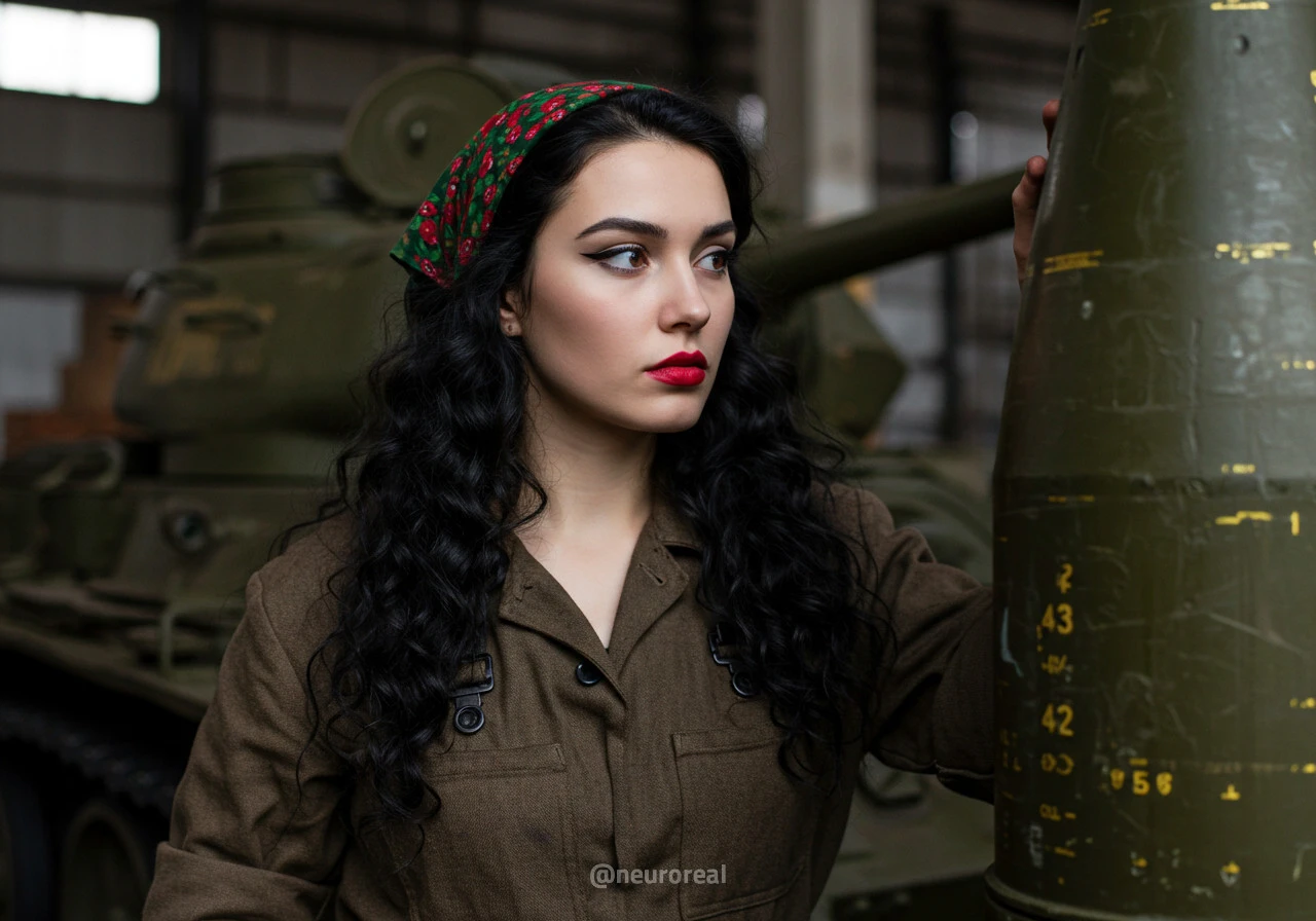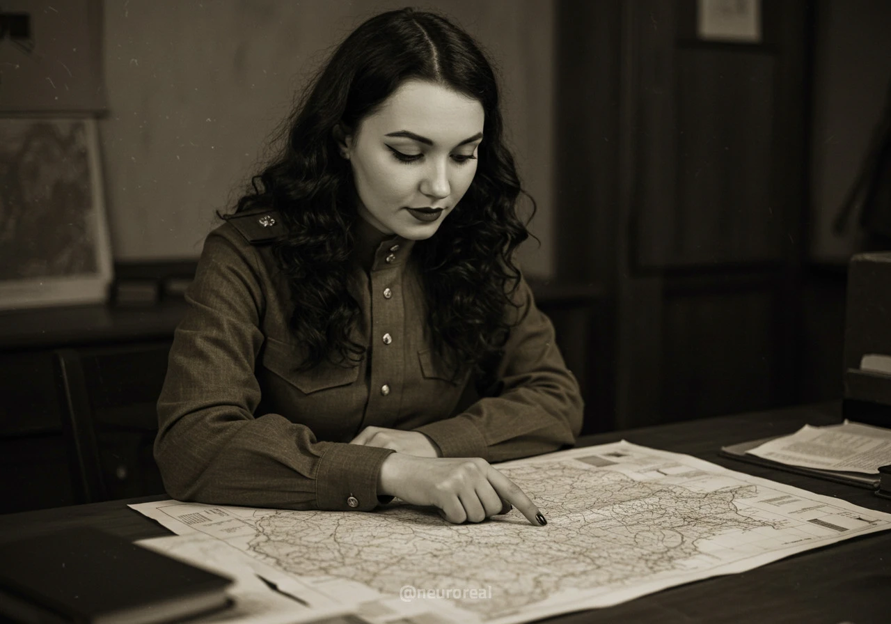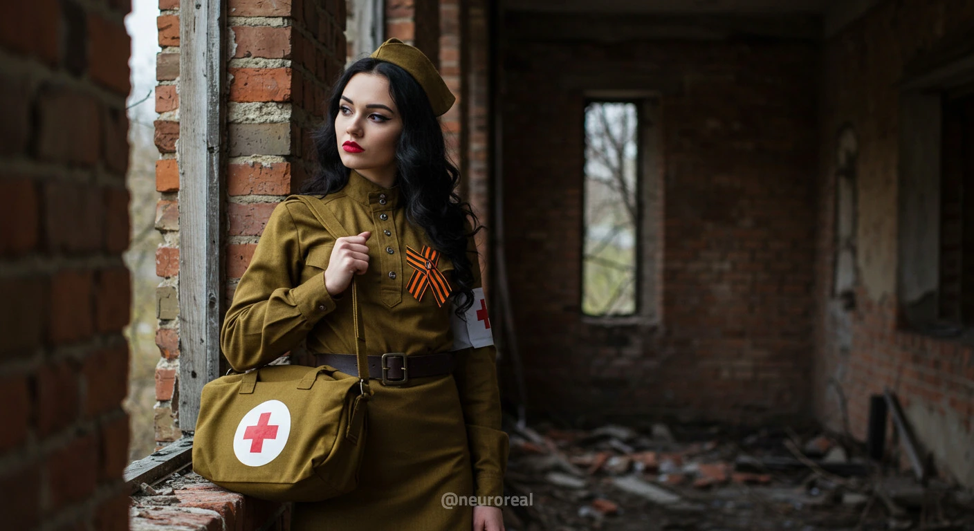 "Фотосессия посвящена событиям Второй мировой войны, отражающим напряжённость и драматизм эпохи. Через образы молодой героини передаются эмоции, решимость и мужество в условиях военного конфликта. Снимки реконструируют историческую атмосферу и подчёркивают значимость пережитого времени."