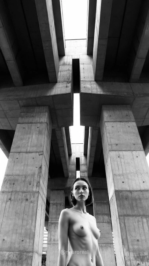 "В объективе представлен честный монохром. Холодная геометрия бетона и ржавая эстетика заброшенных зданий становятся декорациями для триумфа живого тела. Черно-белый снимок безжалостно отсекает цветовой шум. В фокусе остается лишь игра света на коже, графичность теней и дерзкий контраст между индустриальной мощью города и естественной женской пластикой. Это эстетика «сырого» кадра. Фактурные трещины на стенах и стальные балки лишь сильнее подчеркивают пронзительную искренность момента.