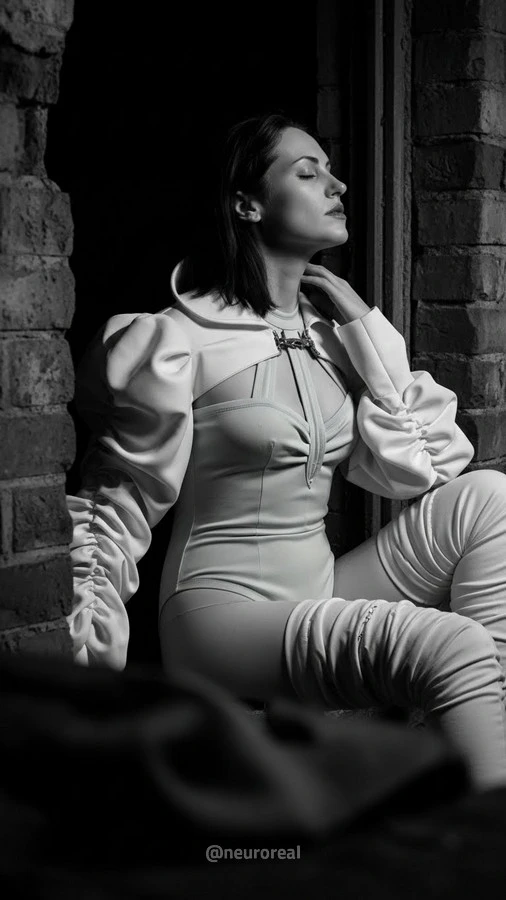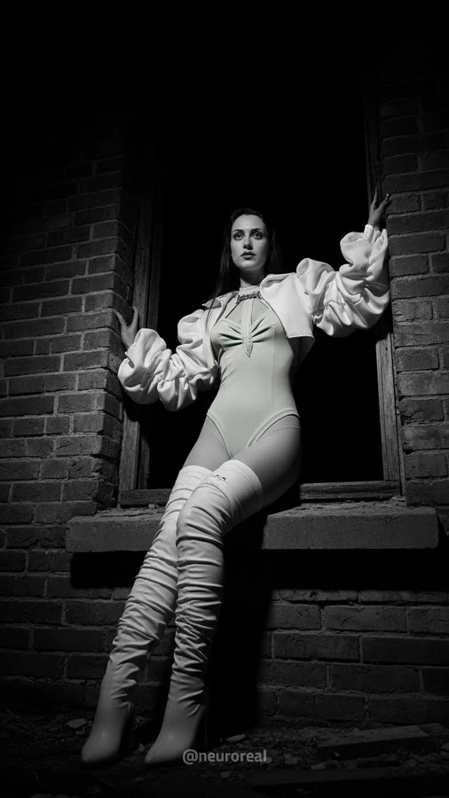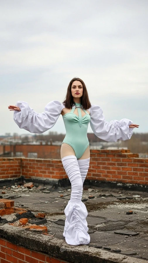 "Среди серых шрамов осыпающегося бетона и гулкой пустоты она казалась видением, сотканным из света и воздуха, — пришелицей из грядущей эры. Ослепительная белизна её рукавов, подобных пойманным и усмиренным облакам, вступала в безмолвный спор с мрачным полумраком руин, а мятный оттенок боди сиял холодным, призрачным неоном. Она замерла посреди хаоса словно драгоценный синтетический цветок, проросший сквозь пыль веков: символ стерильной, безупречной красоты, торжествующей над неизбежным распадом старого мира."