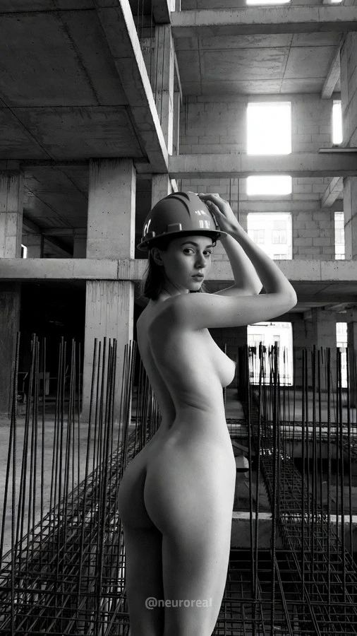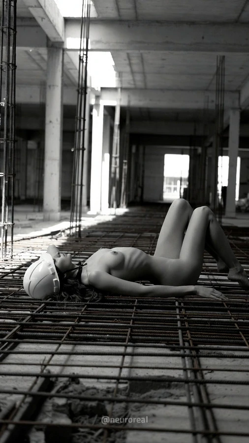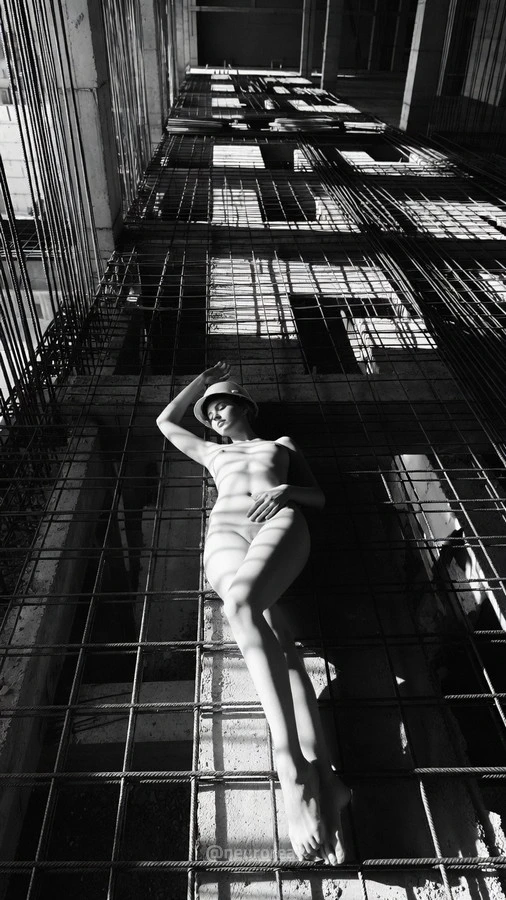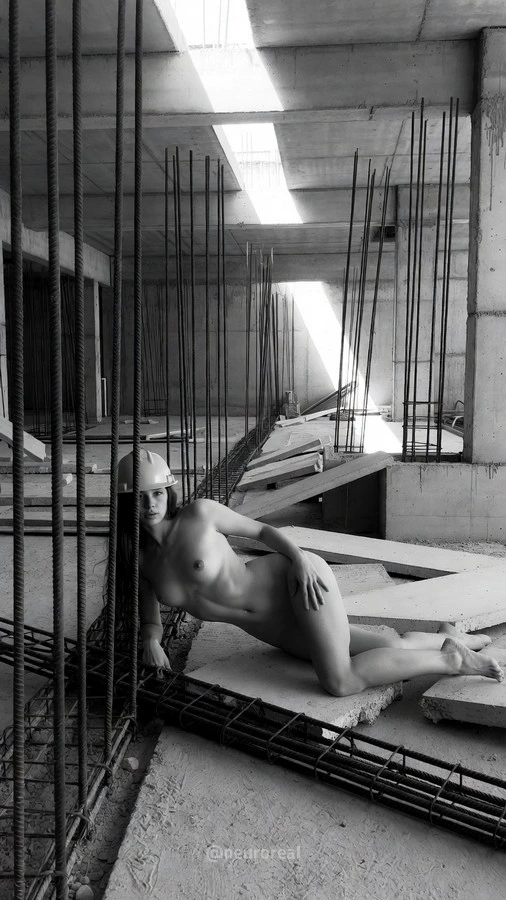 "Игра контрастов на строительной площадке превращает грубый индустриальный хаос в изысканное полотно. Бетонные плиты и оголенная арматура здесь не просто фон, а метафора стойкости, на которой мягкие изгибы женского тела кажутся еще более хрупкими. Чёрно-белая гамма отсекает всё лишнее, заставляя сфокусироваться на тактильном противостоянии: холодный шероховатый камень против тепла гладкой кожи в пространстве, где нет ничего лишнего.