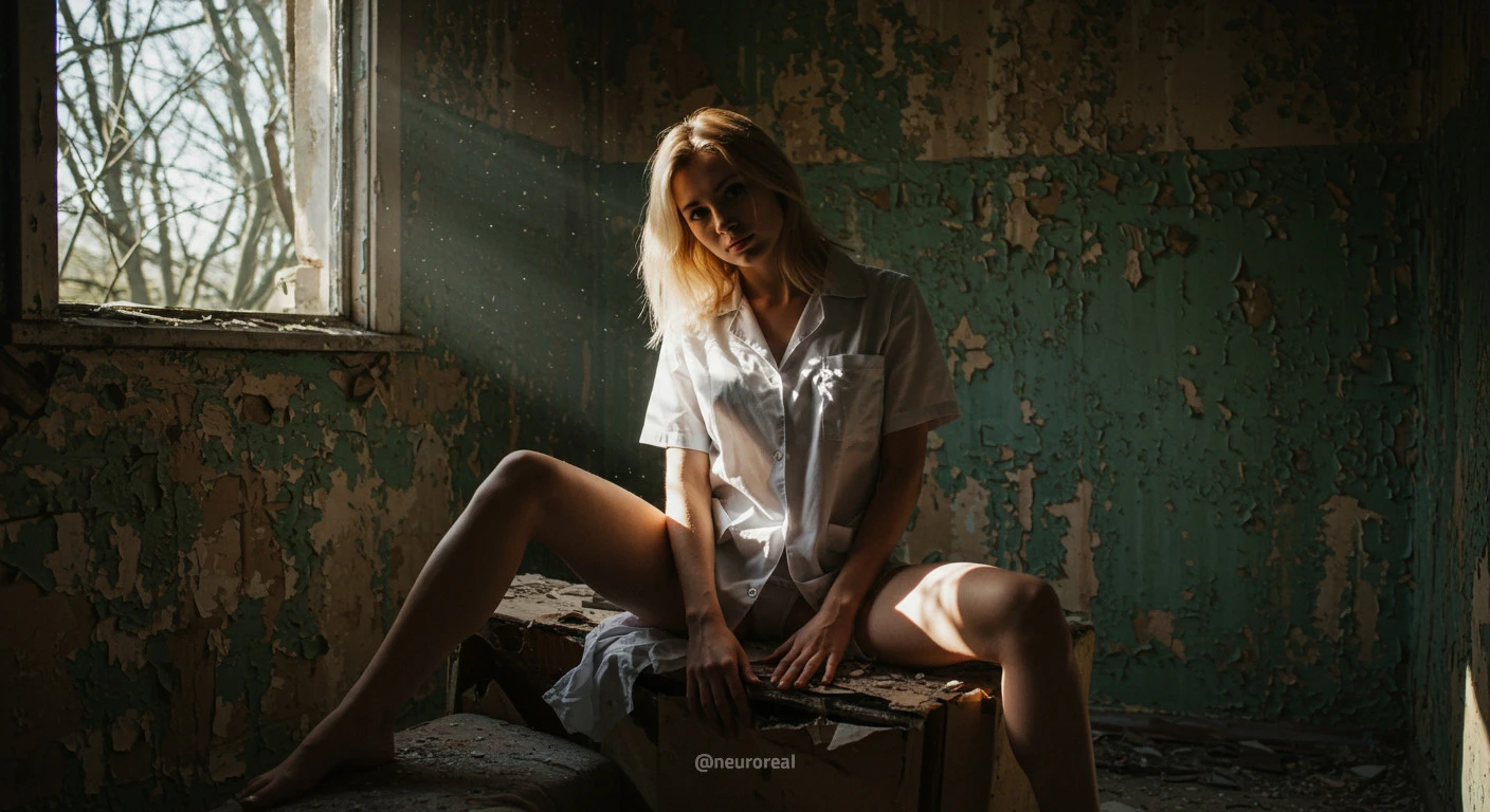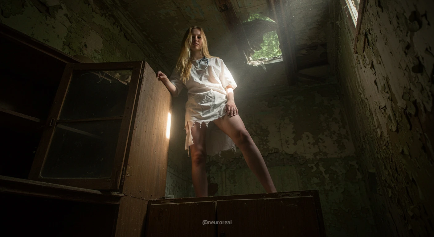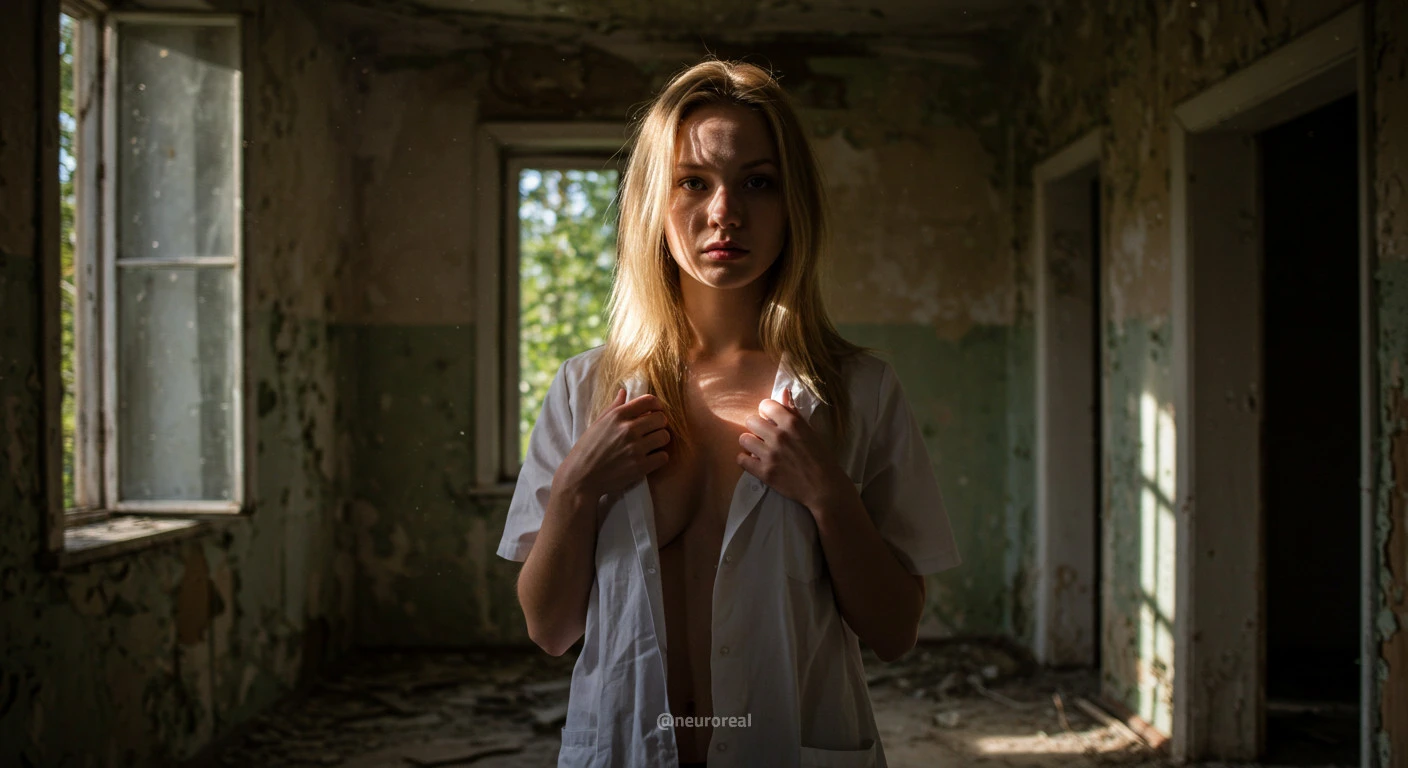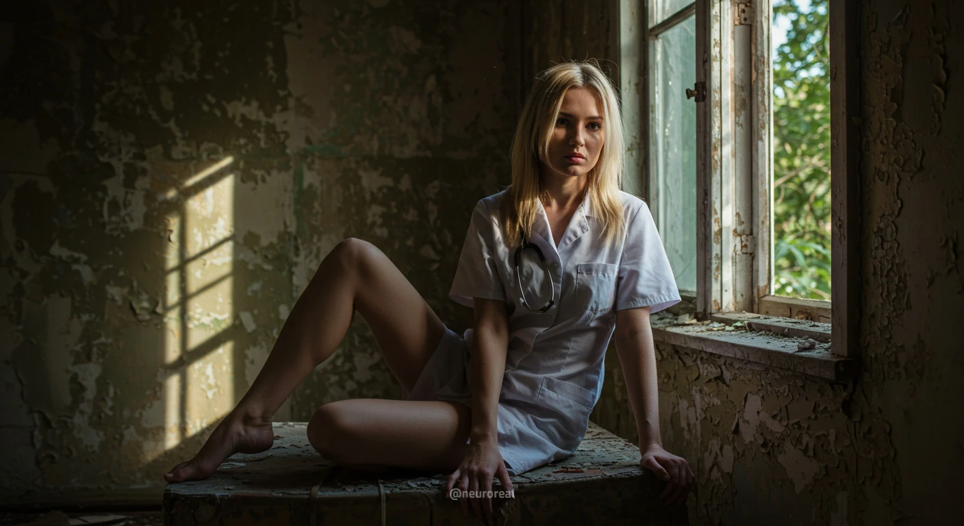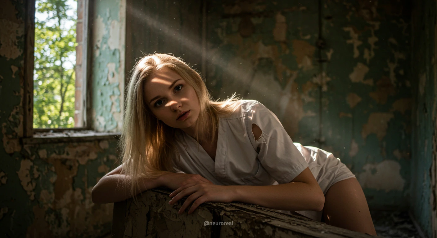 "Девушка-медсестра в порванном халате становится центральной фигурой среди обветшалых стен заброшенного дома, где каждый уголок дышит мрачной тишиной и ушедшим временем. Солнечные лучи, проникающие сквозь полуразрушенные ставни, ложатся причудливыми узорами на облезлую штукатурку, подчеркивая одновременно хрупкость ее силуэта и зловещую ауру запустения, царящую вокруг."