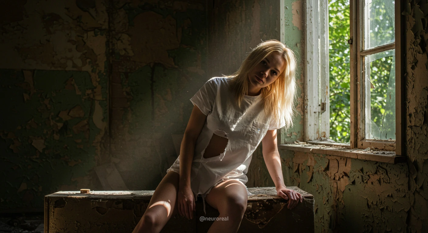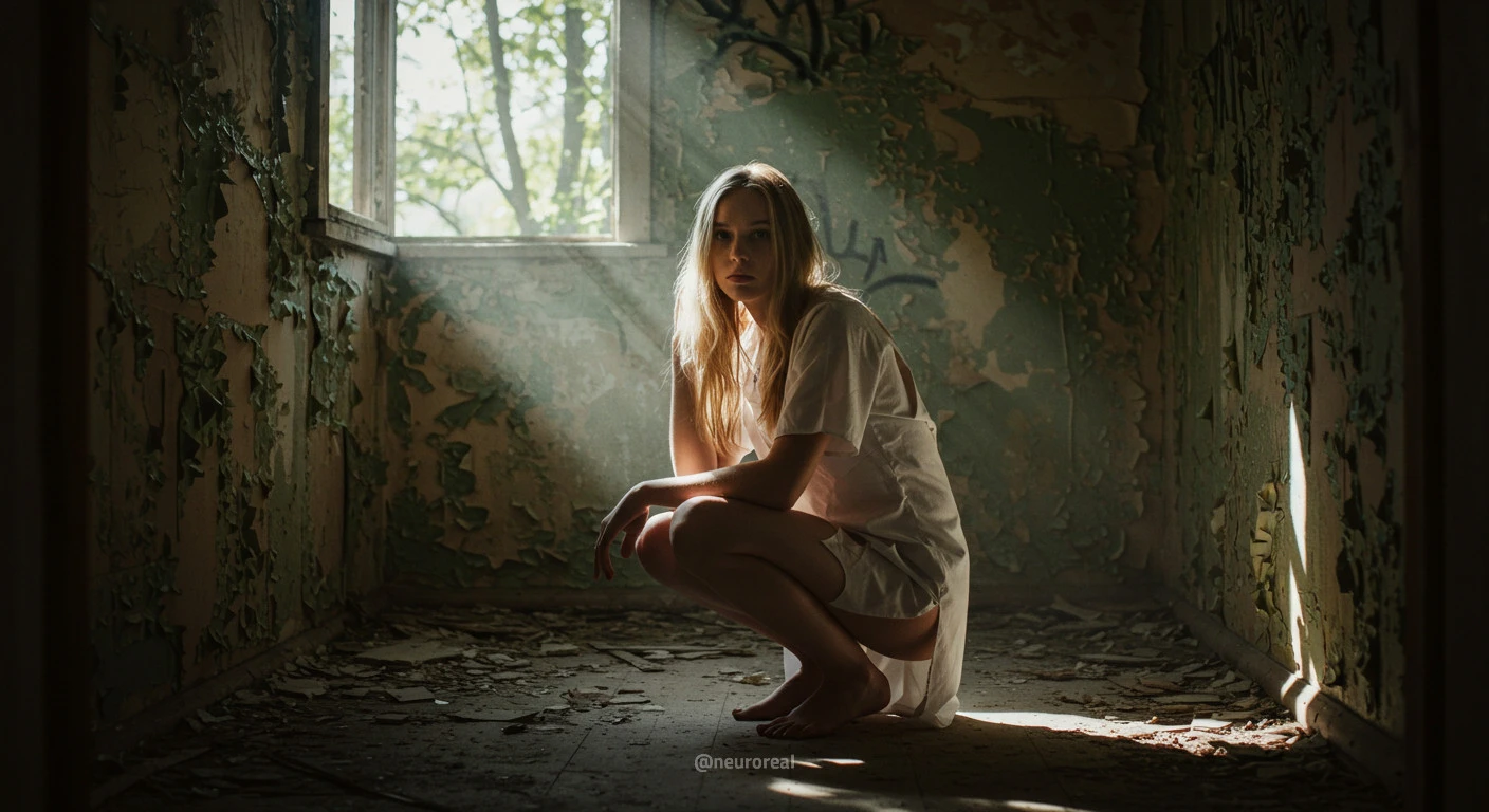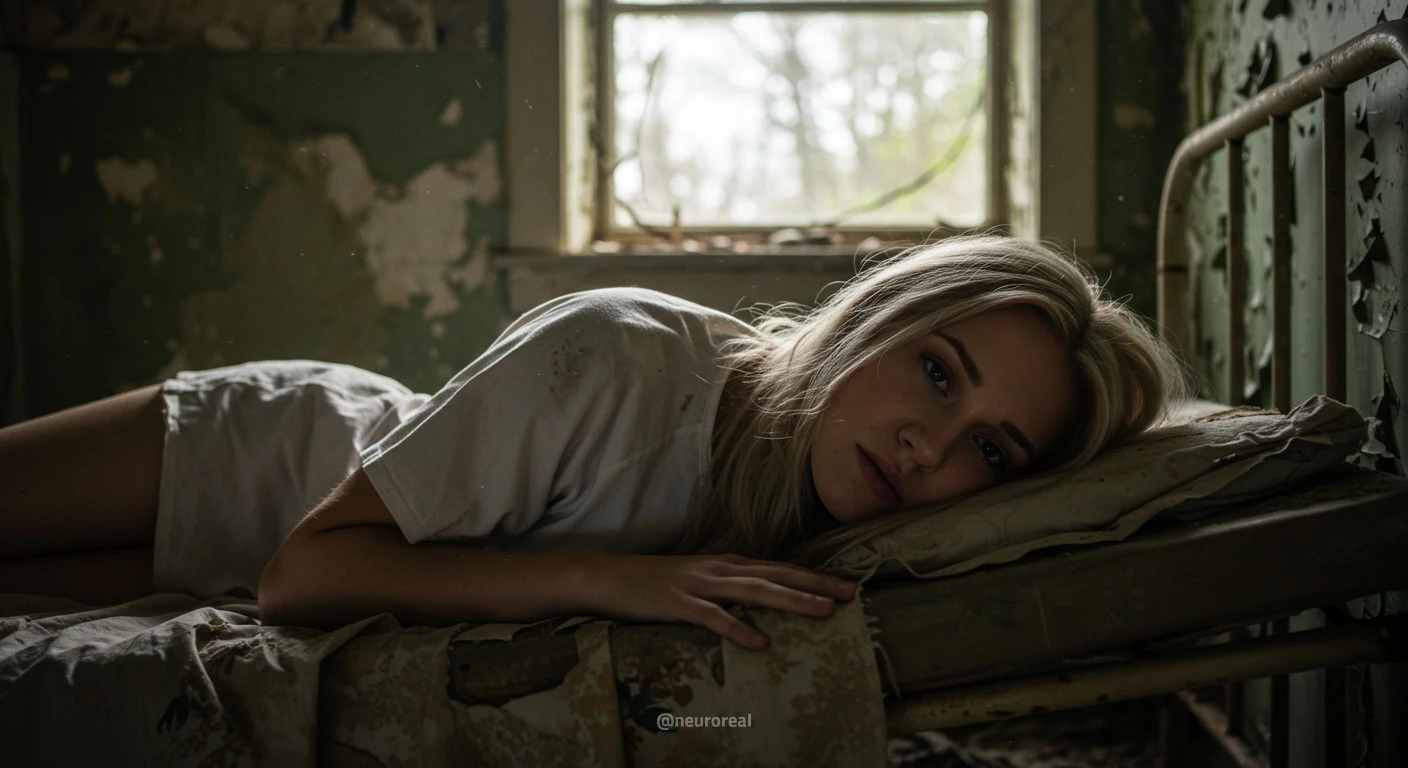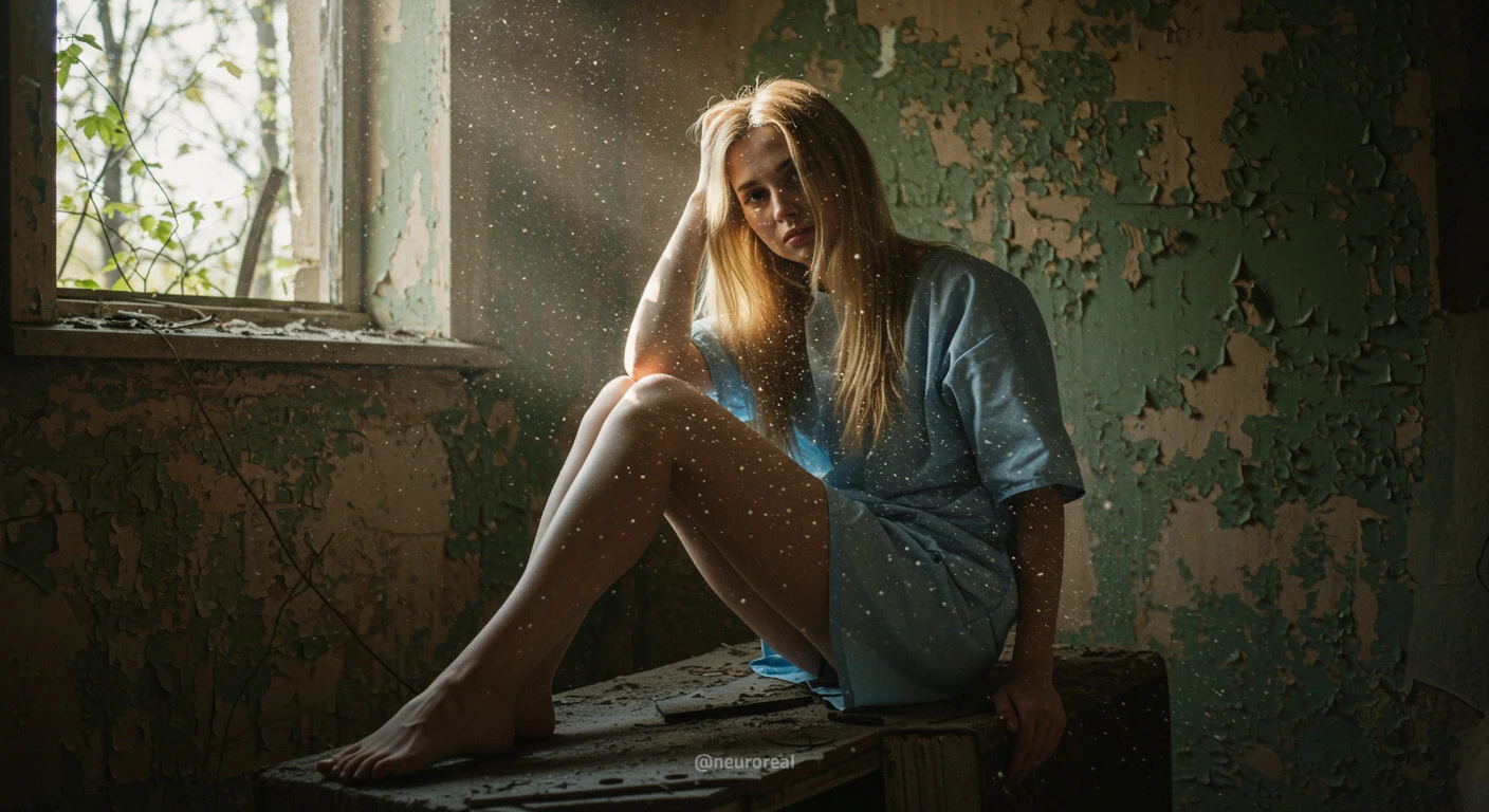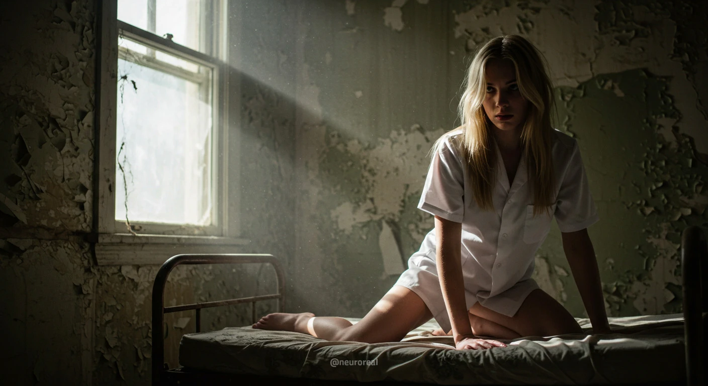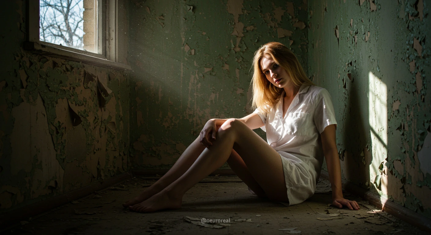 "Девушка-медсестра в порванном халате становится центральной фигурой среди обветшалых стен заброшенного дома, где каждый уголок дышит мрачной тишиной и ушедшим временем. Солнечные лучи, проникающие сквозь полуразрушенные ставни, ложатся причудливыми узорами на облезлую штукатурку, подчеркивая одновременно хрупкость ее силуэта и зловещую ауру запустения, царящую вокруг."