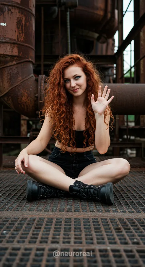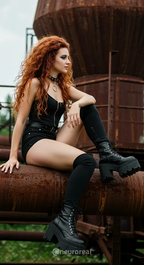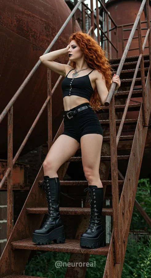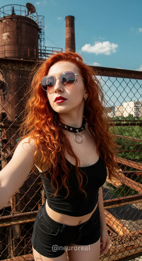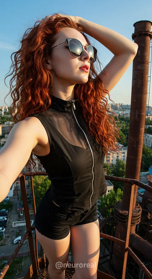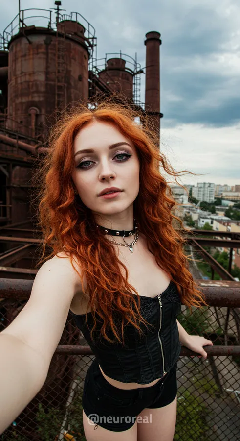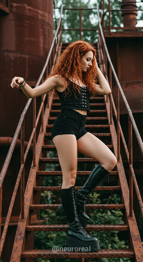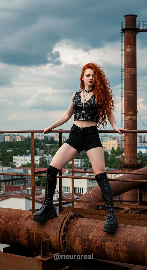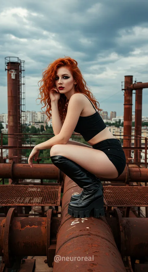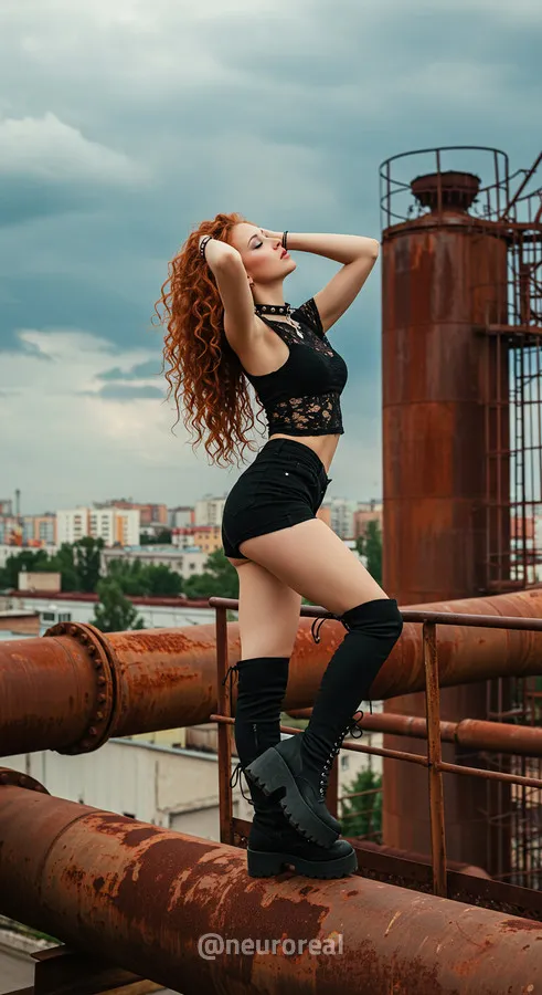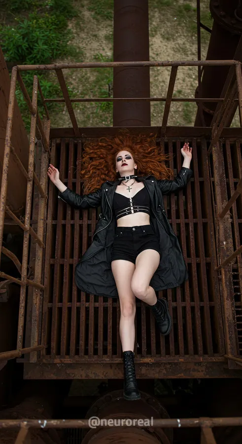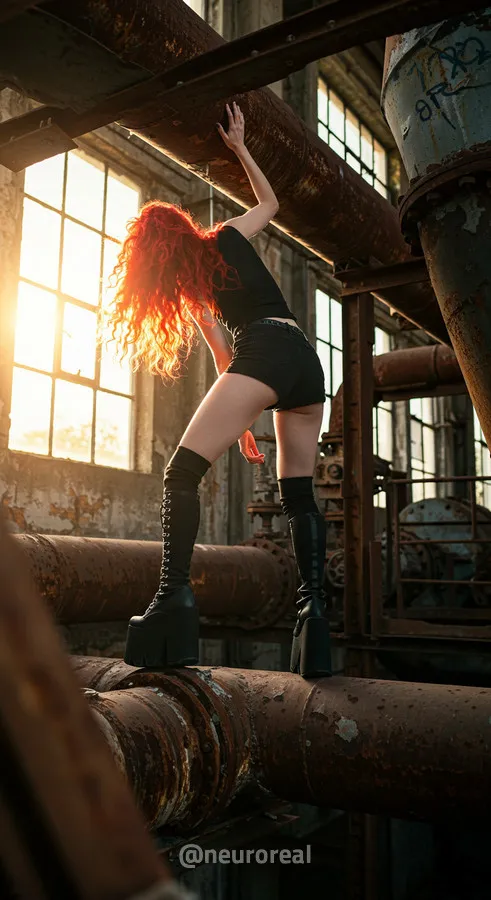 "Среди холодного антуража заброшенного завода девушка создает смелый и дерзкий образ, где ржавчина на старых трубах подчеркивает индустриальную атмосферу. Восходя по металлическим лестницам на головокружительную высоту, она словно олицетворяет хрупкость, противостоящую грубой мощи прошлого, превращая унылые конструкции в произведение искусства."