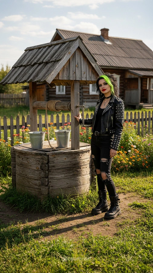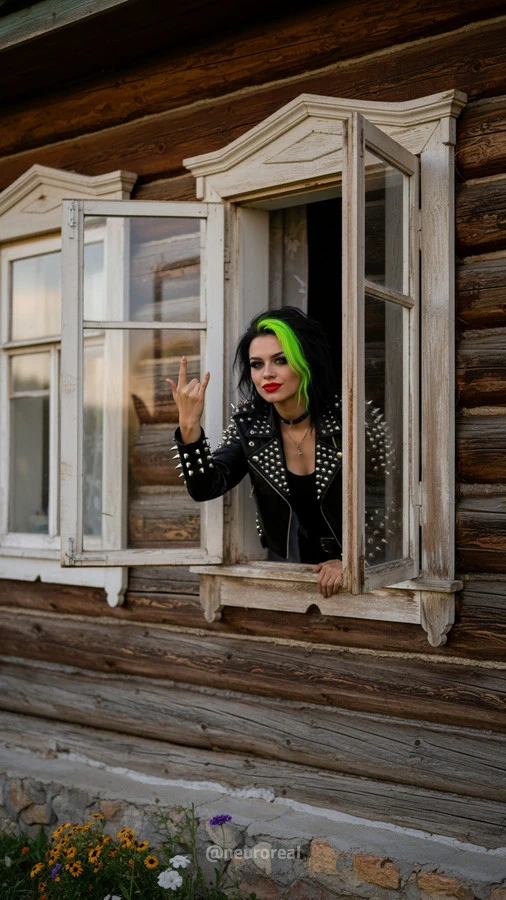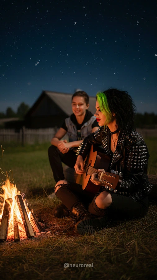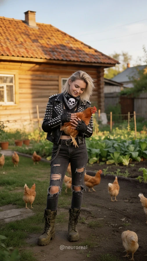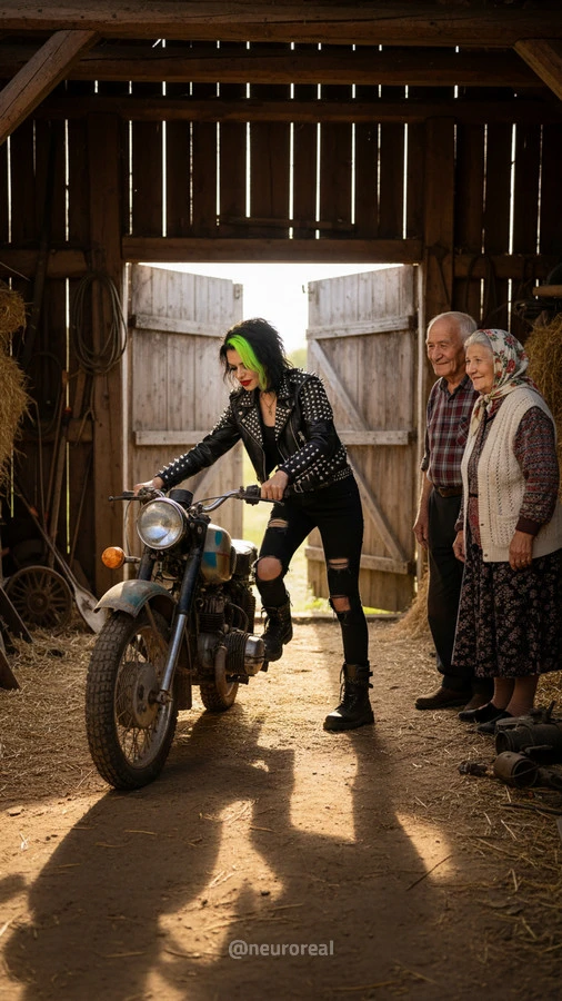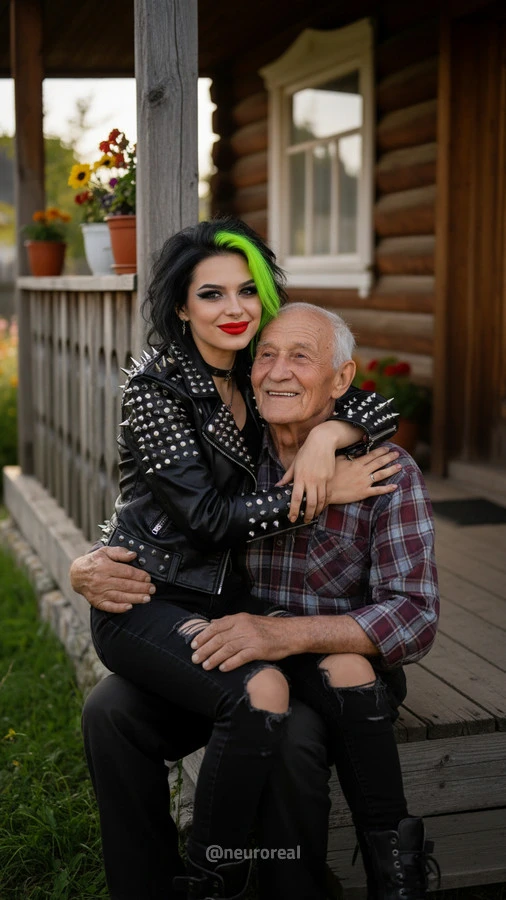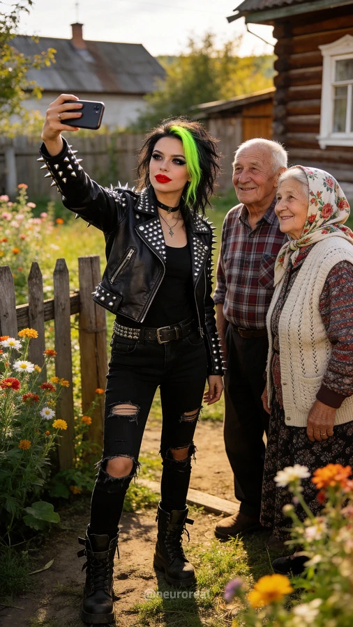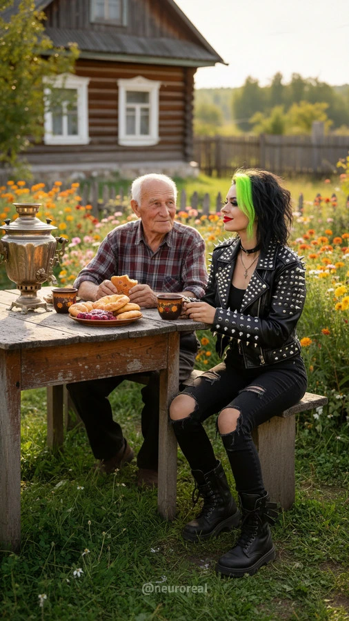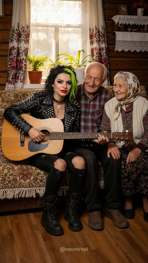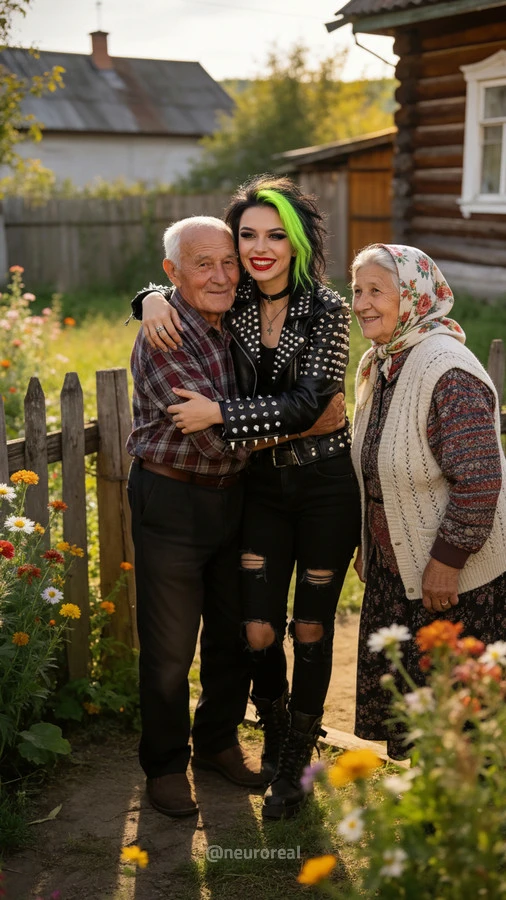 "Девушки в дерзких образах панков гостят в глубинке у бабушки с дедушкой, создавая удивительный контраст поколений. Яркие волосы, кожаные куртки и атрибутика субкультуры соседствуют с уютными платками и добрыми улыбками старшего поколения, подчеркивая неожиданную гармонию между бунтарским духом молодости и мудрой простотой деревенской жизни."