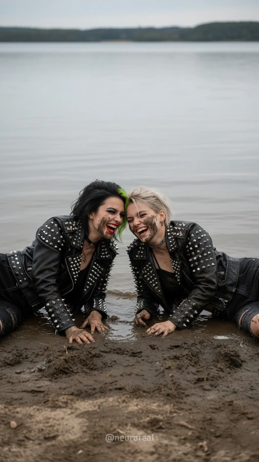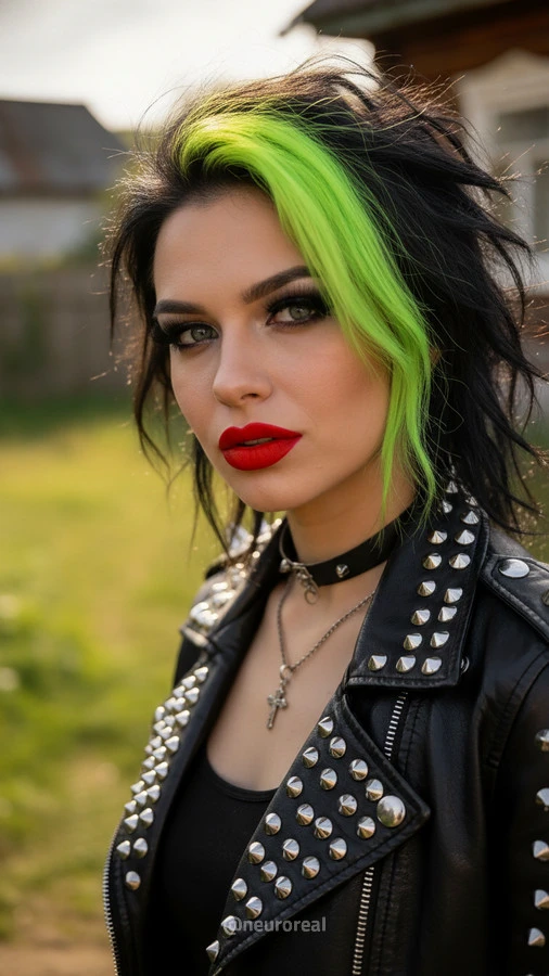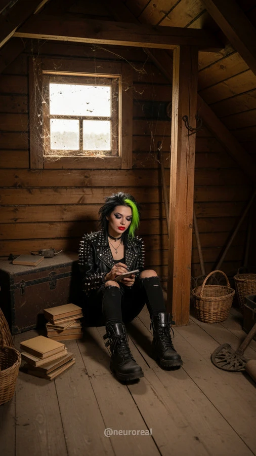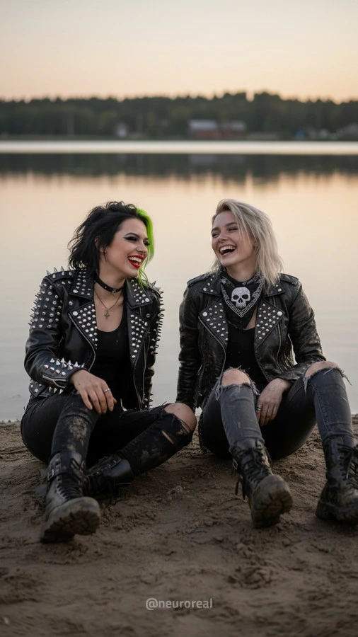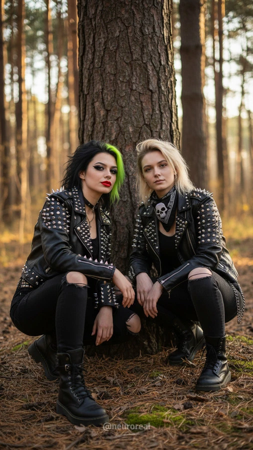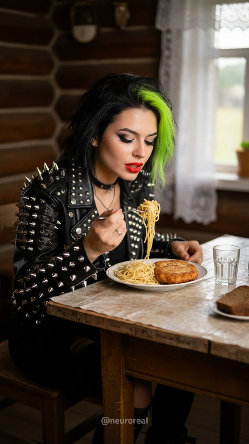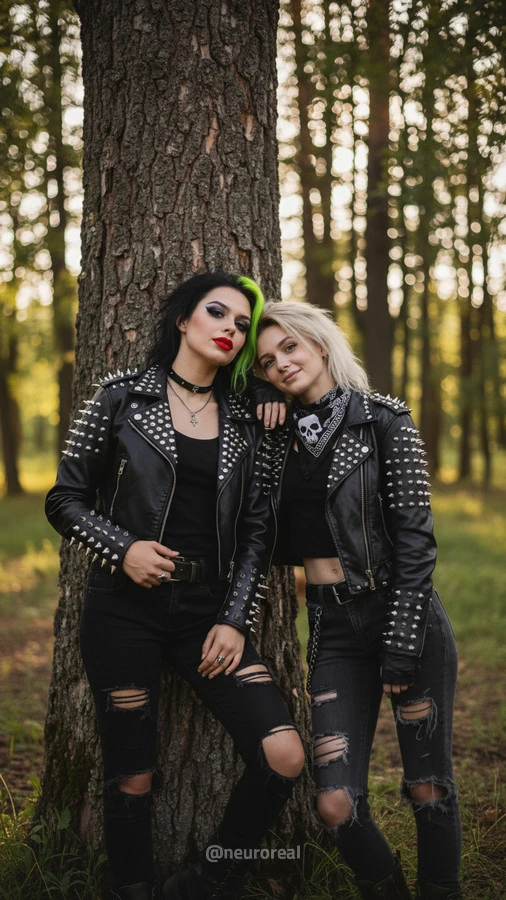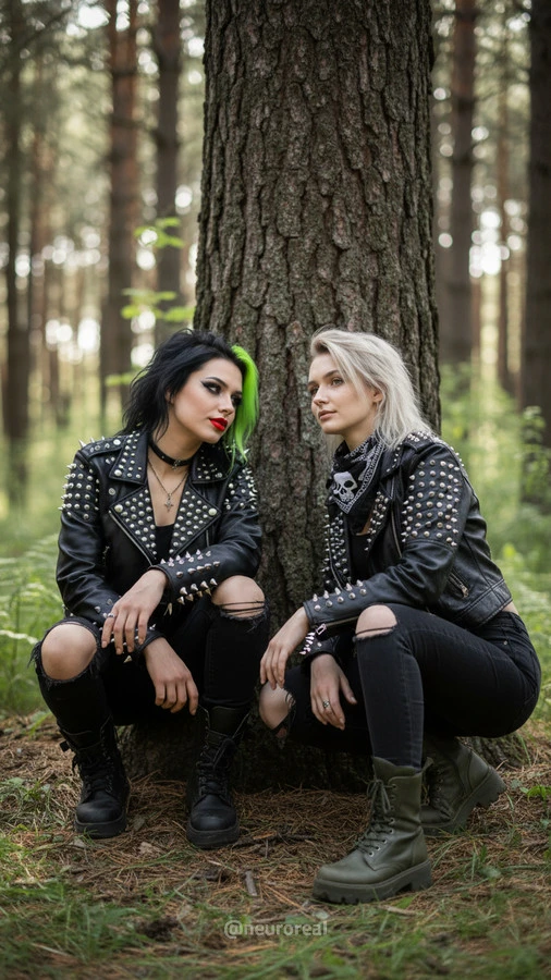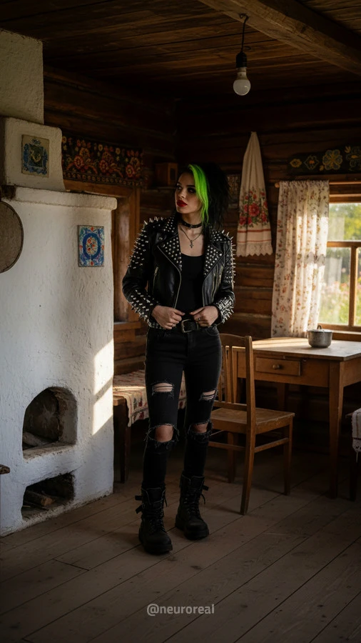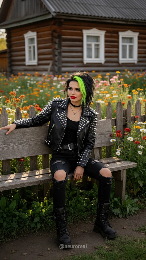 "Девушки в дерзких образах панков гостят в глубинке у бабушки с дедушкой, создавая удивительный контраст поколений. Яркие волосы, кожаные куртки и атрибутика субкультуры соседствуют с уютными платками и добрыми улыбками старшего поколения, подчеркивая неожиданную гармонию между бунтарским духом молодости и мудрой простотой деревенской жизни."
