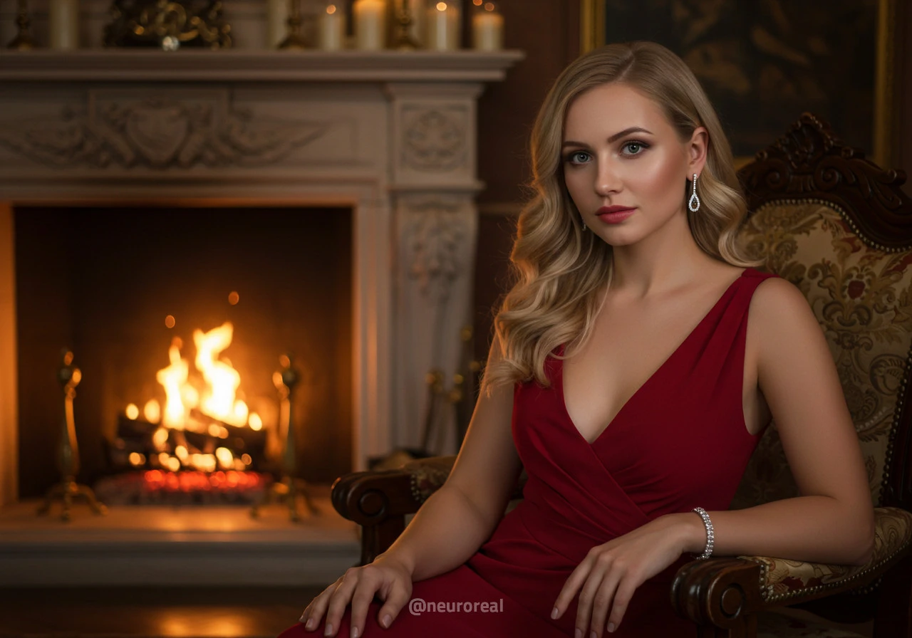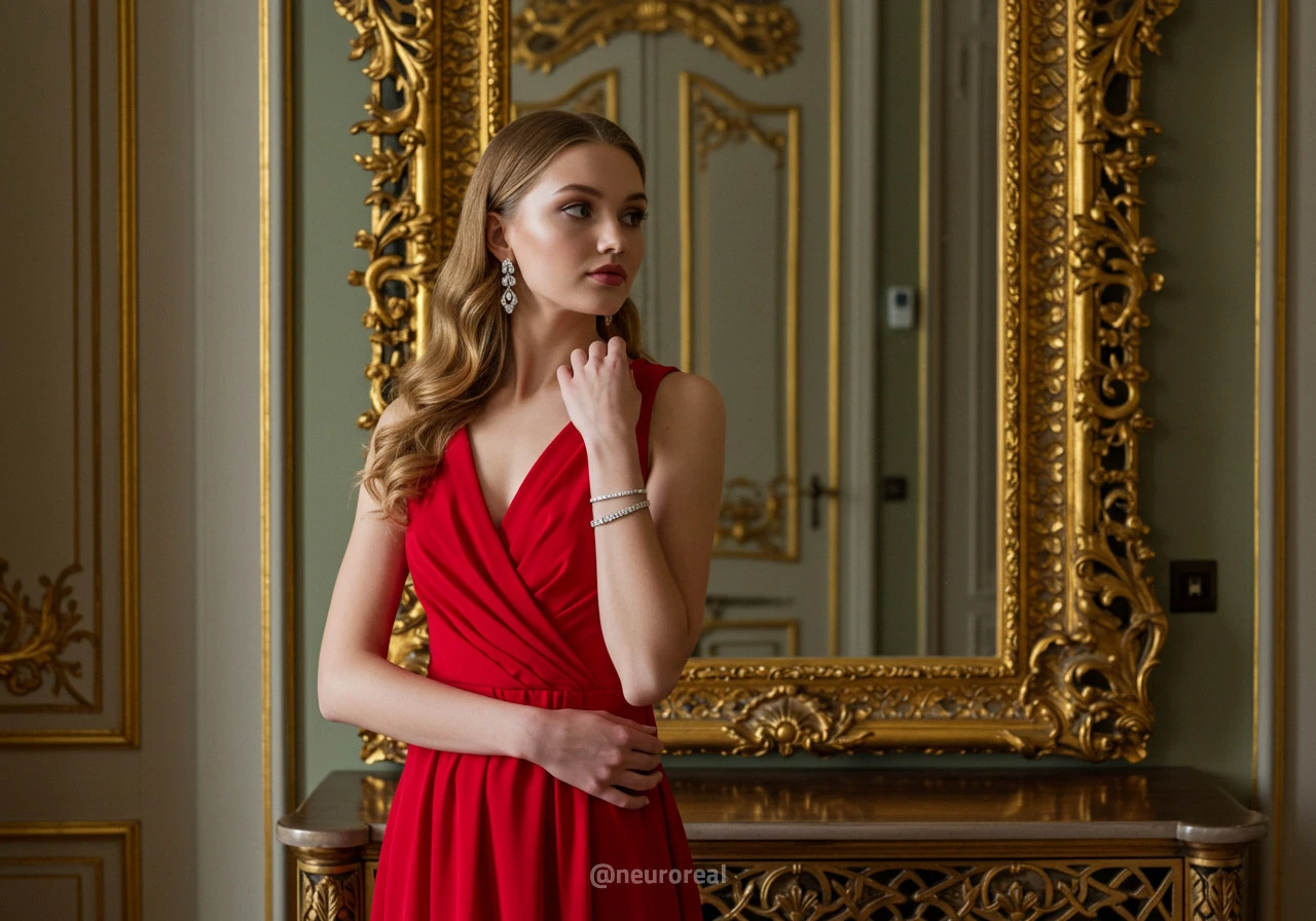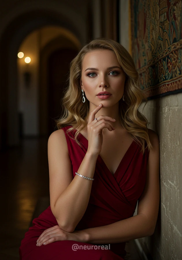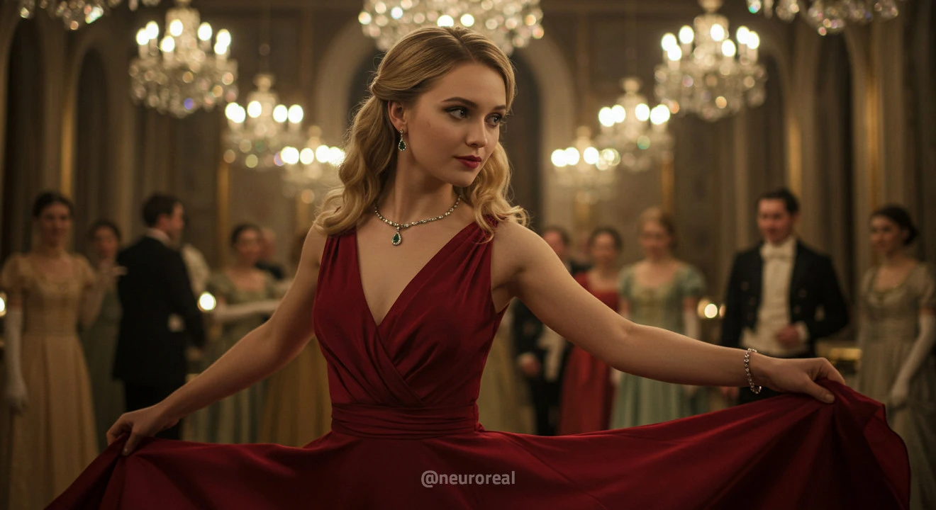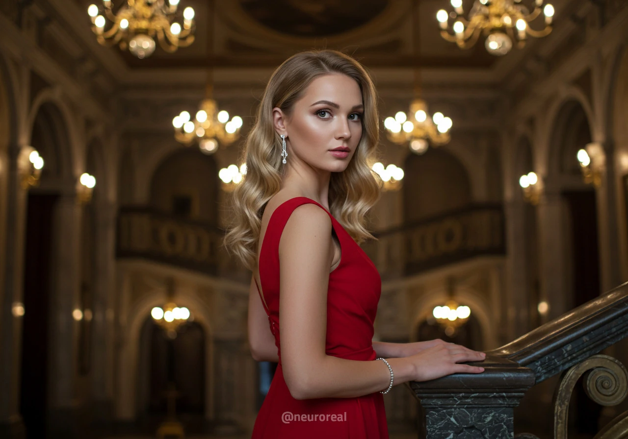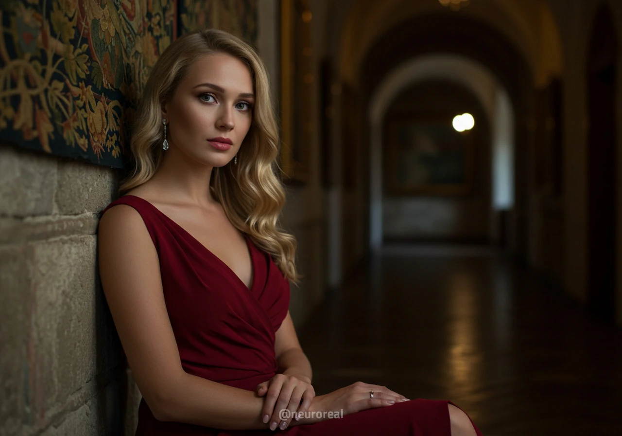 "Фотосессия переносит зрителя в роскошь XIX века, где девушка в красном платье становится ярким акцентом среди антикварных интерьеров замка. Среди гостей за ужином при свете люстр или на балу под мелодии вальса она соединяет эпохи, излучая элегантность и уверенность."