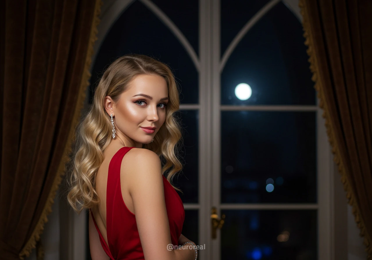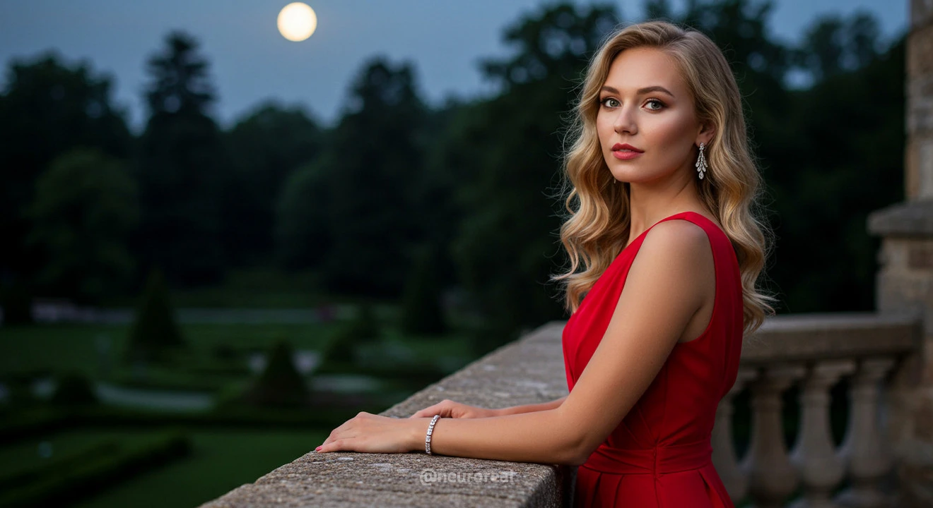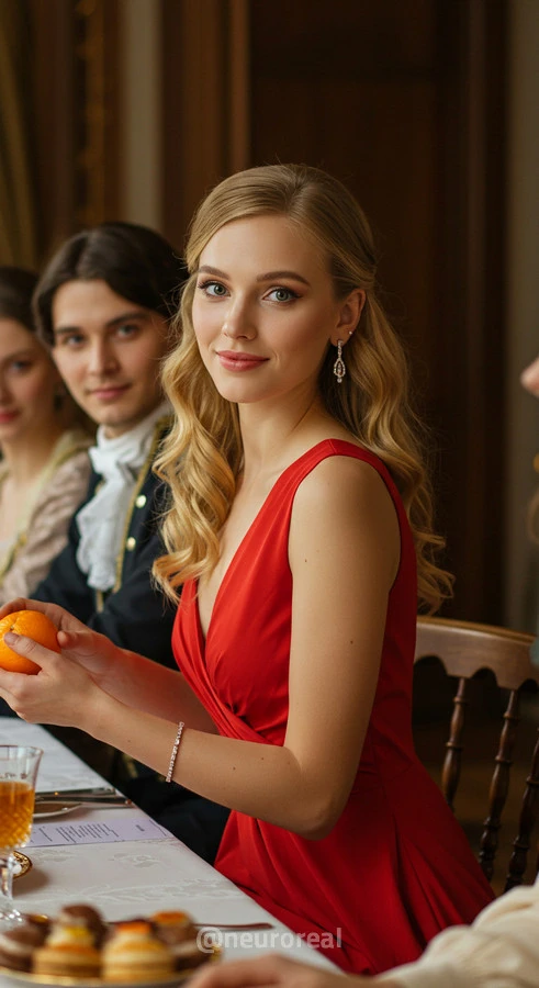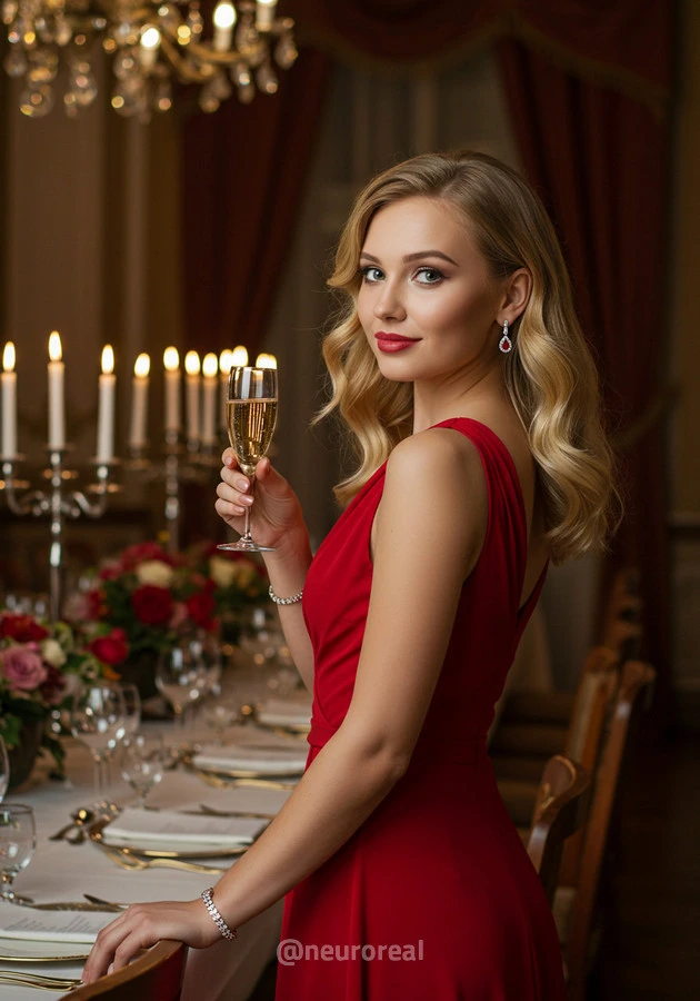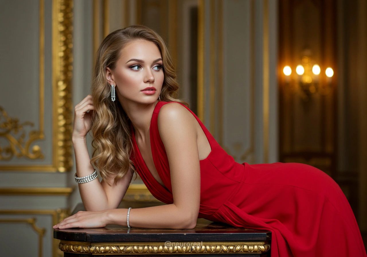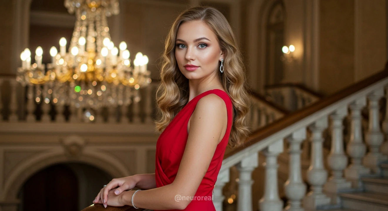 "Фотосессия переносит зрителя в роскошь XIX века, где девушка в красном платье становится ярким акцентом среди антикварных интерьеров замка. Среди гостей за ужином при свете люстр или на балу под мелодии вальса она соединяет эпохи, излучая элегантность и уверенность."