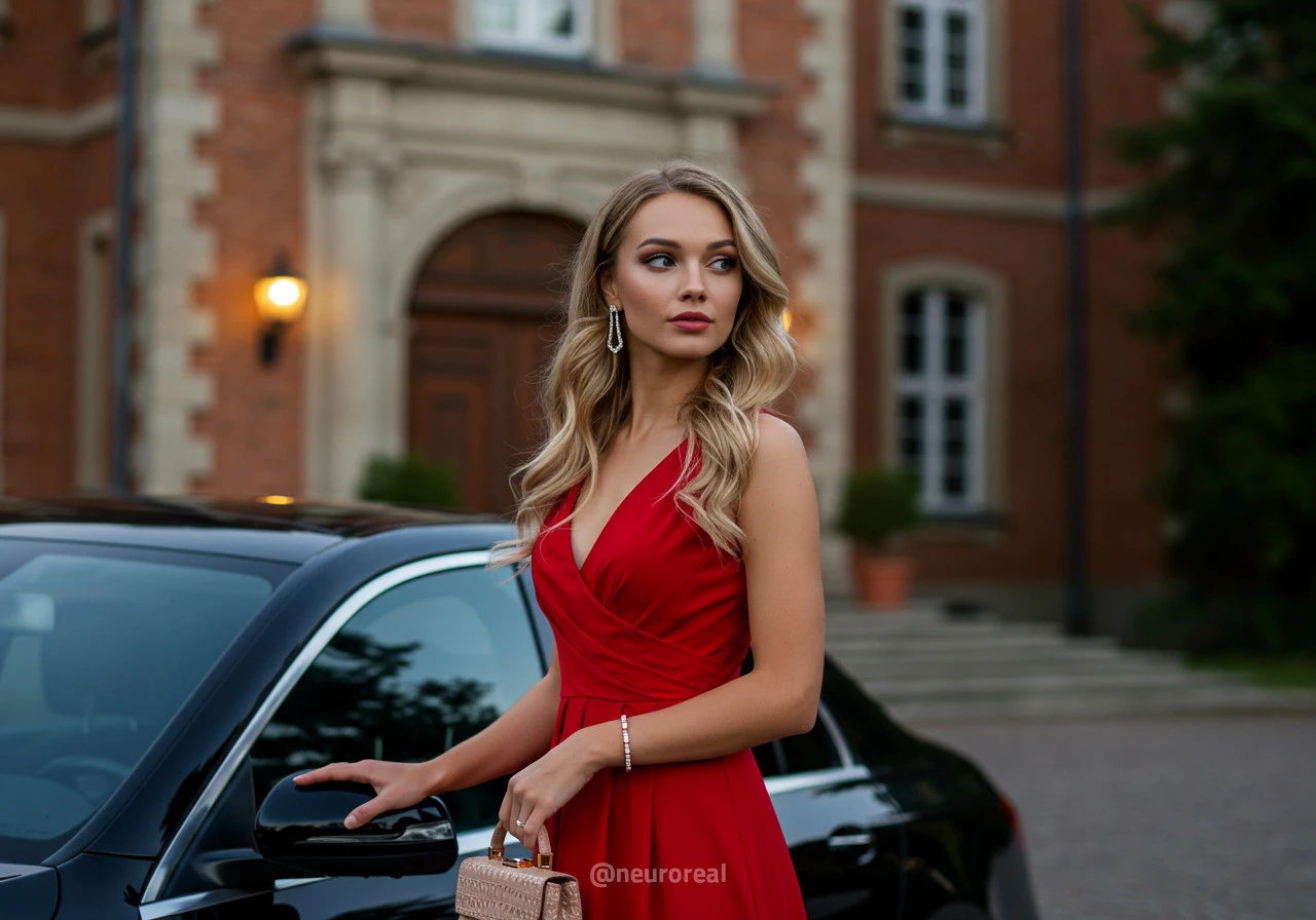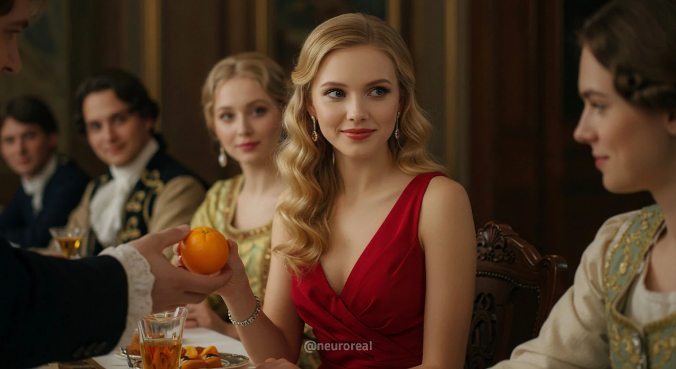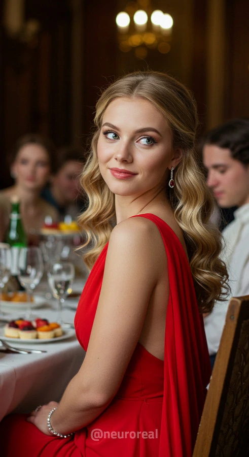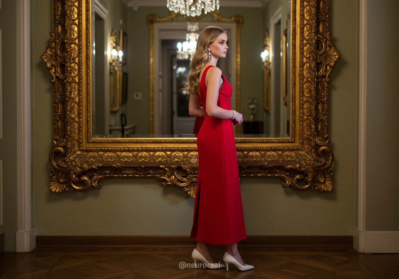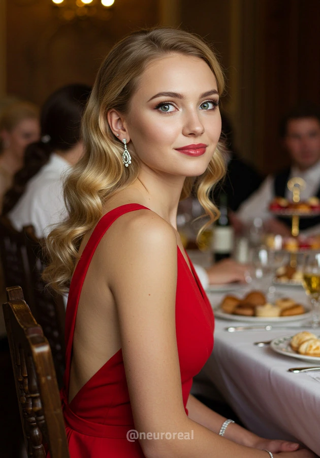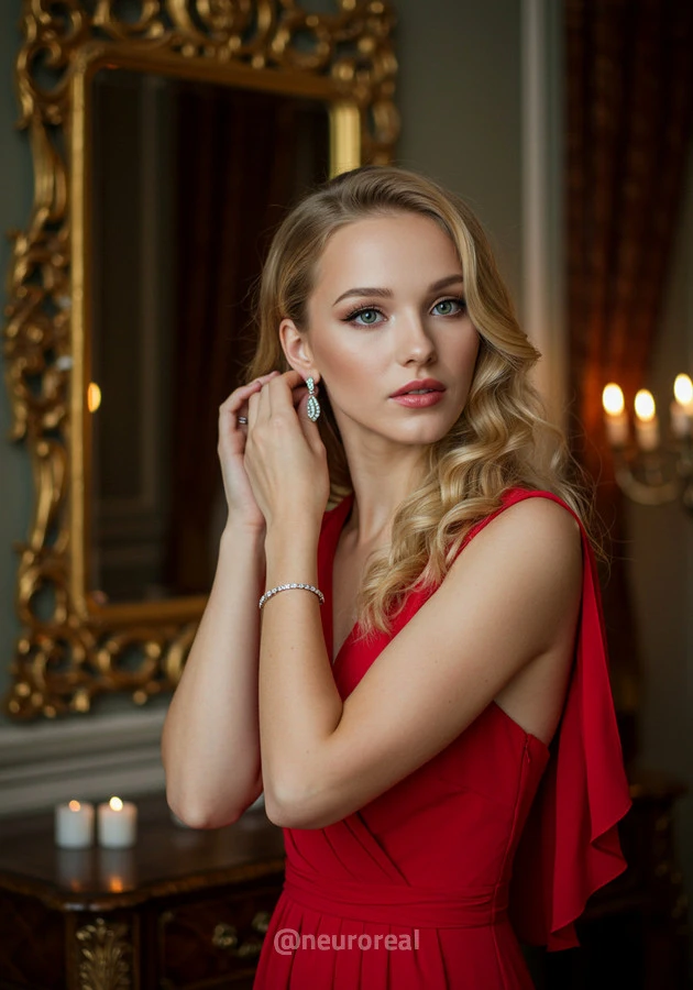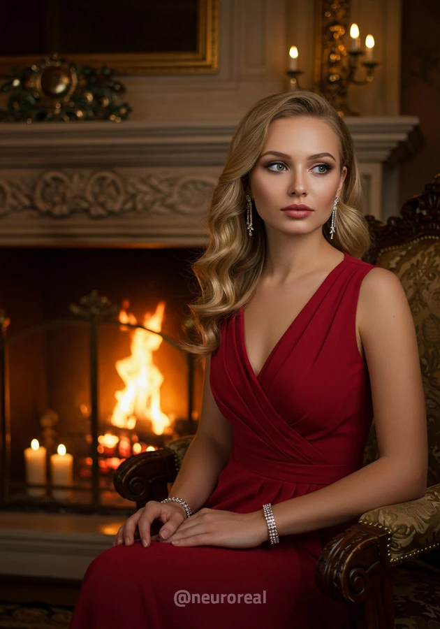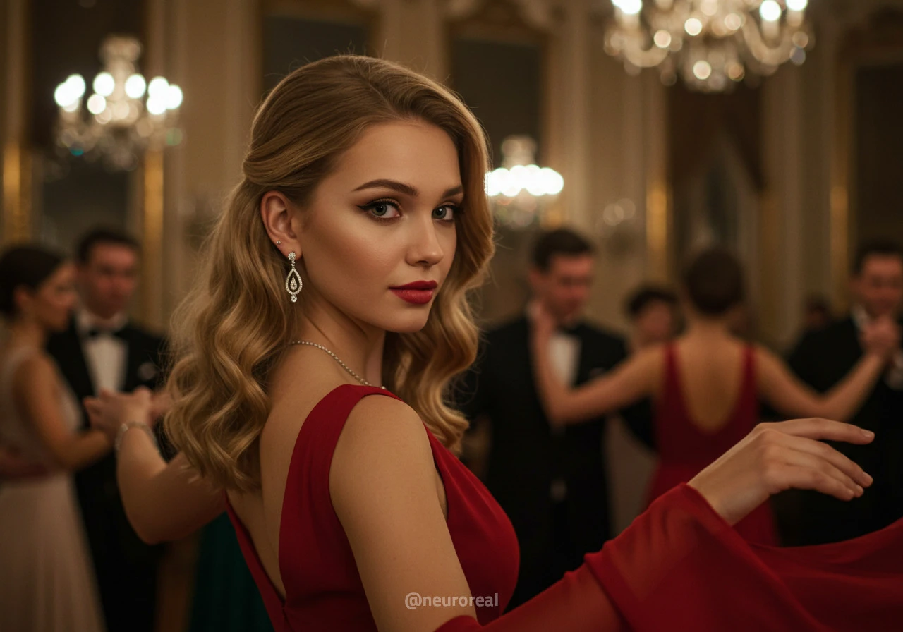 "Фотосессия переносит зрителя в роскошь XIX века, где девушка в красном платье становится ярким акцентом среди антикварных интерьеров замка. Среди гостей за ужином при свете люстр или на балу под мелодии вальса она соединяет эпохи, излучая элегантность и уверенность."